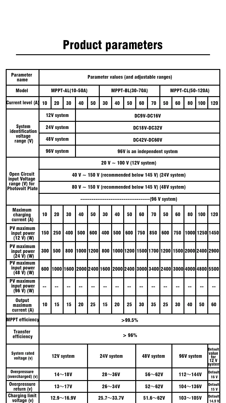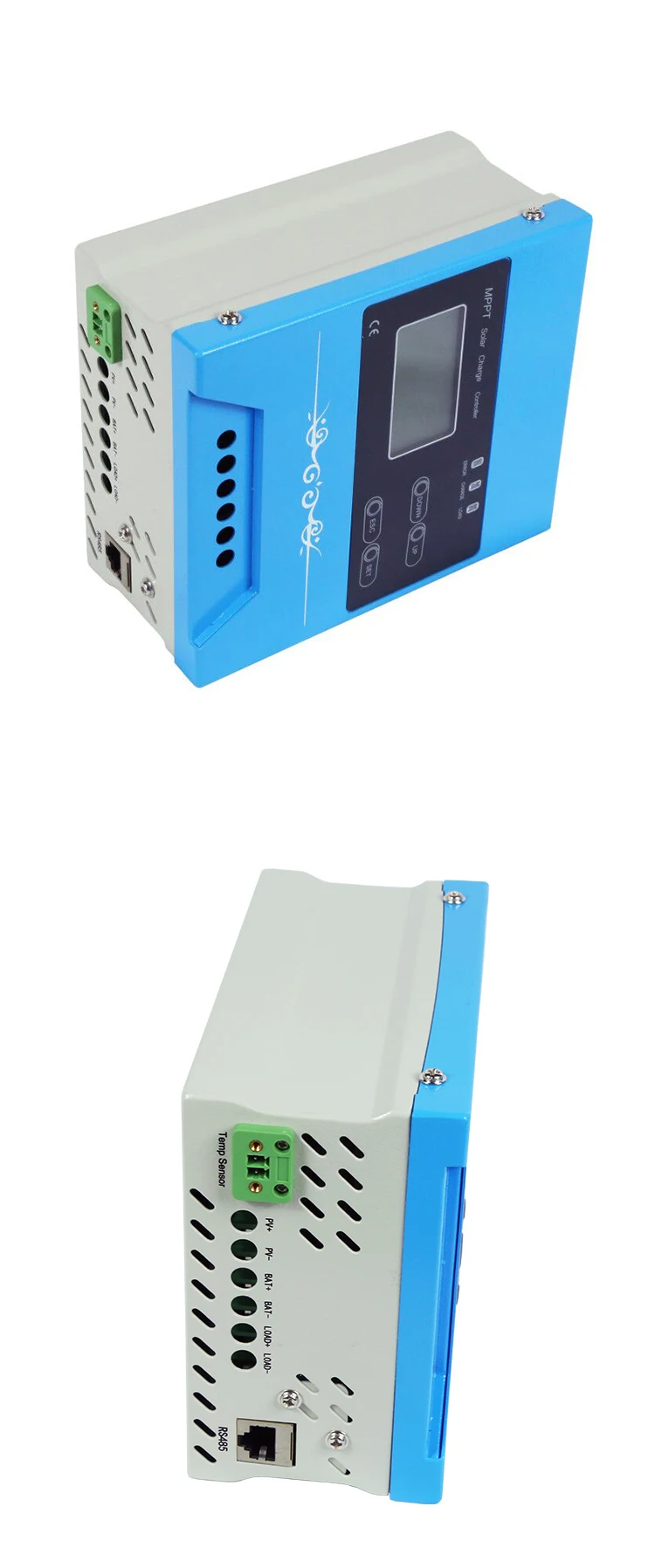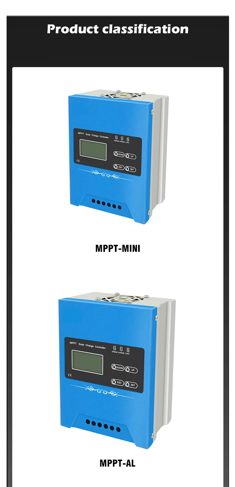 Презентация продукта 1. Усовершенствованная технология синхронного выпрямителя также имеет высокую эффективность преобразования в условиях низкой мощности зарядки. 2. Система принимает общий дизайн отрицательных замыканий, что делает работу системы более стабильной и надежной. 3. Усовершенствованная технология отслеживания максимальной мощности MPPT, эффективность отслеживания не менее 99.5%, по сравнению с общим алгоритмом PWM, эффективность улучшена на 15-20%. 4. Использование высококачественных импортных компонентов, усовершенствованная схема преобразования энергии, максимальная эффективность преобразования может достигать более 98%, Полная эффективность нагрузки может достигать 97%. 5. Конструкция изготовлена из алюминиевого металлического материала и может использоваться в различных тяжелых условиях. 6. В сочетании с различными алгоритмами отслеживания, он может быстро отслеживать максимальную точку питания. 7. Двухволновая пиковая и многоволновая пиковая технология отслеживания все еще может точно отслеживать максимальную точку питания, когда панель частично заблокирована или повреждена одним блоком. 8. 4-сегментный режим зарядки: MPPT-сбалансированный, зарядка-boost, зарядка-плавающий, зарядка. 9, 12 / 24 / 48 V автоматической функцией распознования. 10. Поддерживается хранение данных и время хранения может быть до 10 лет. 11. С режимом ограничения тока, когда входная мощность фотоэлектрической платы слишком велика, и ток зарядки превышает номинальный ток контроллера, контроллер ограничит зарядный ток до номинального тока. 12. Контроллер имеет функцию обнаружения температуры. Когда температура контроллера поднимается до 70 градусов, контроллер ограничит зарядный ток до половины номинального тока, а когда температура достигает 90 градусов, контроллер выключит зарядку и выход, тем самым контролируя повышение температуры контроллера. 13. Связь RS485, протокол связи может быть предоставлен для облегчения унифицированного управления и вторичного развития клиента (опционально). 14. Контроллер может подключаться к верхнему компьютеру через RS485 и поддерживать расширение модуля Wi-Fi и модуля GPRS для реализации облачного мониторинга приложений (опционально). 15. И имеет функцию компенсации температуры аккумулятора. 16. Он имеет широкий диапазон рабочего напряжения фотоэлектрической системы (12 В система, напряжение фотоэлектрической пластины до 100 В, 24 В и 48 В максимальное напряжение до 150 в). 17. Он имеет комплексные функции защиты, такие как перезарядка, перезарядка, перегрев, перегрузка, обратное соединение и т. д. Параметры продукта MPPT-AL Вес: 1,5 кг Размер: 186*146*81 мм MPPT-BL Вес: 2,3 кг Размер: 240*170*97 мм