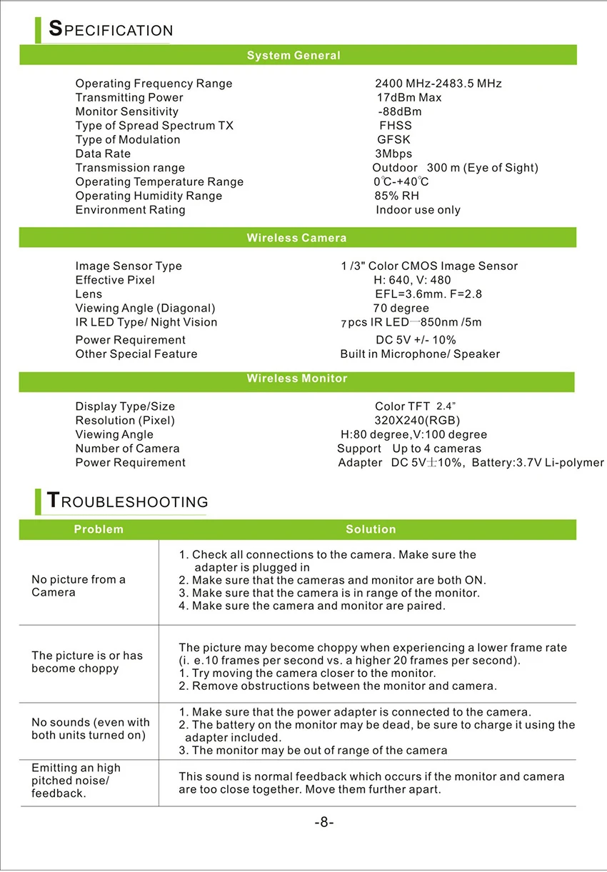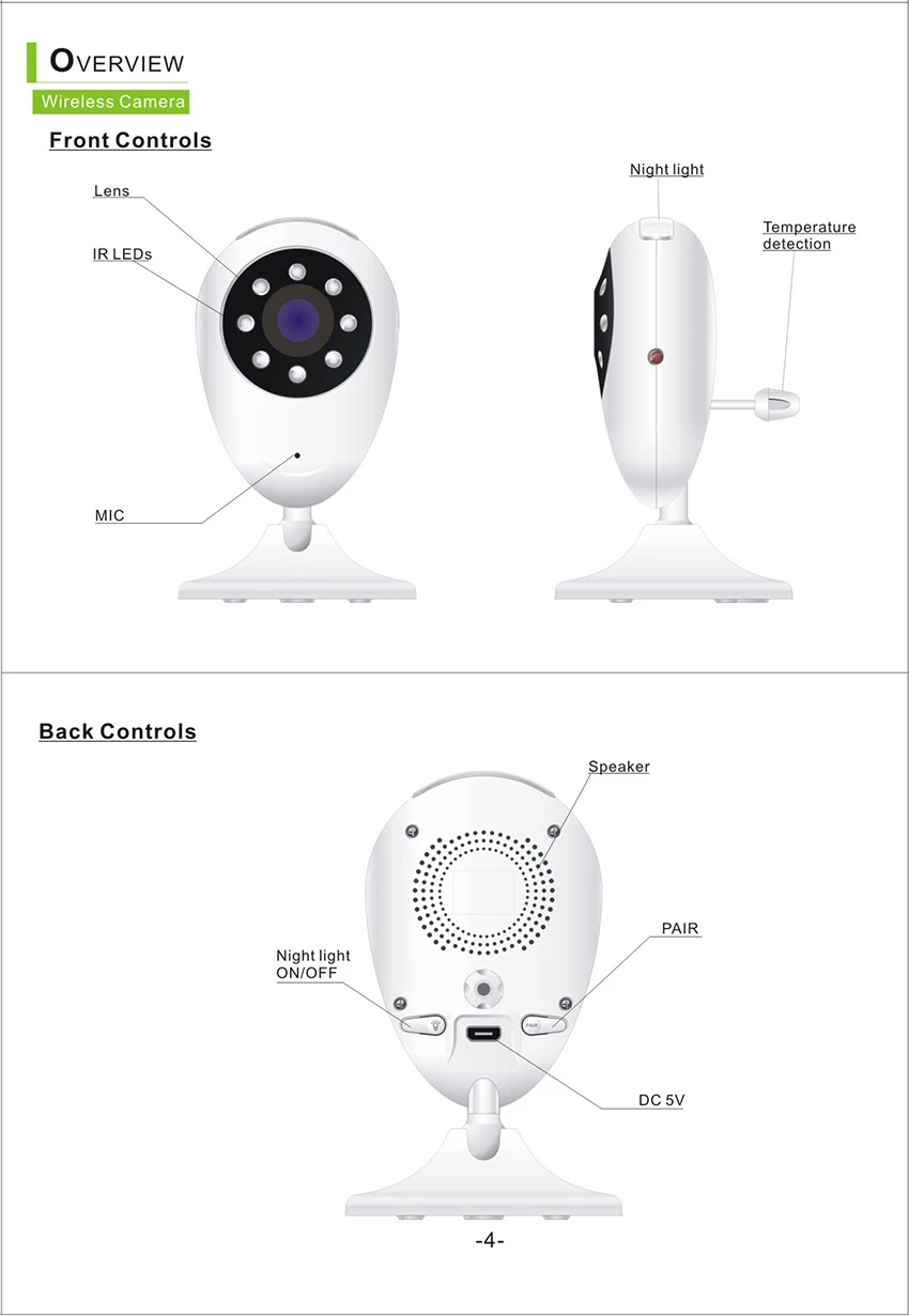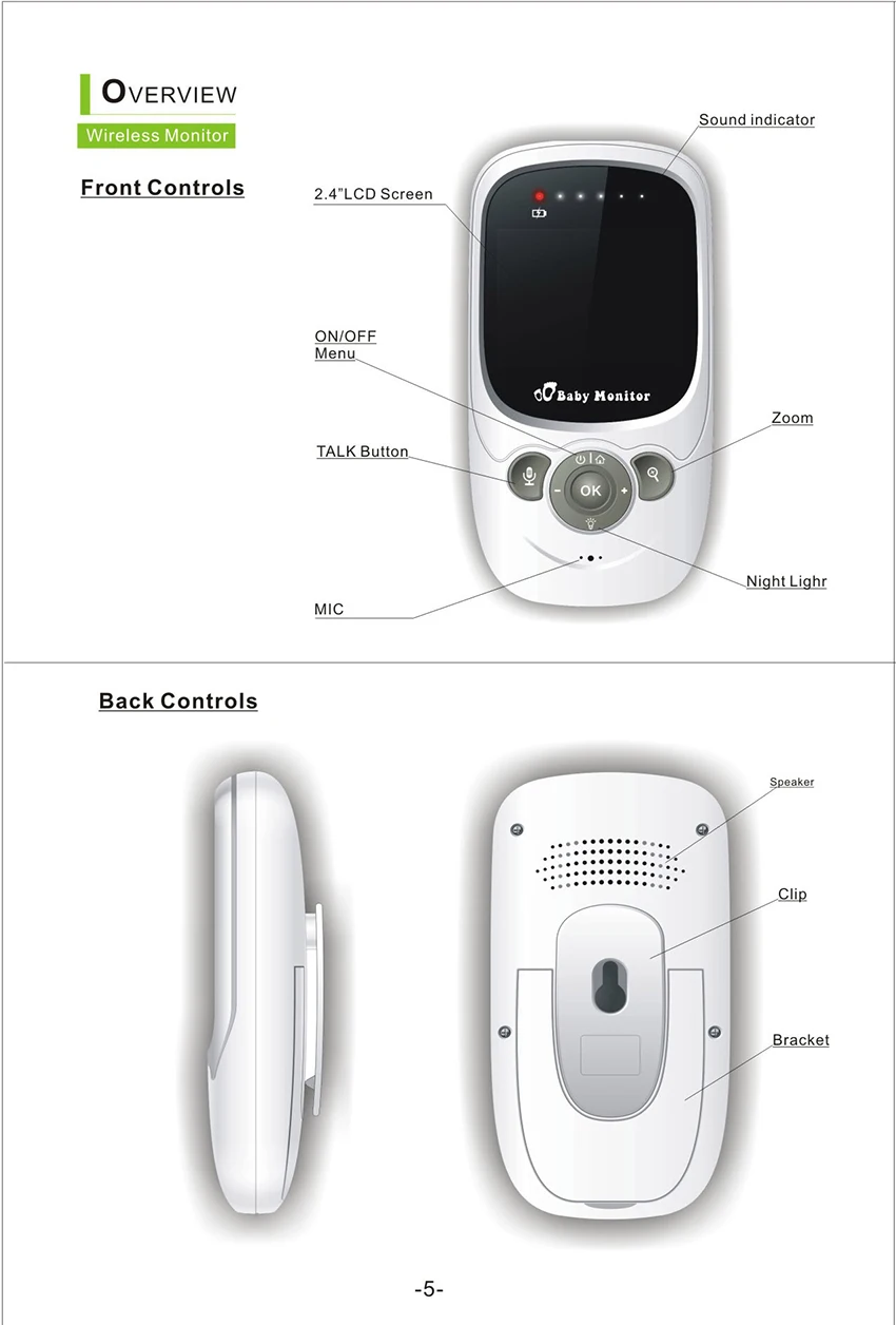 • 2,4 дюймов TFT ЖК-дисплей экран• 2,4 ГГц Беспроводная цифровая технология, никаких помех, не конфиденциальности утечки• Встроенный литий-Ночной светильник• Колыбельная: пусть ваш ребенок засыпает быстрее;• Расстояние ночного видения: 5 м• Передача в открытой среде около 100 м• Приемник имеет встроенный литиевый аккумулятор, и конец камеры непосредственно преобразуется в питание;• Встроенный микрофон и динамик/Двусторонняя аудиосвязь• Испытание температуры в помещении ребенка Посылка включает в себя: 1 предмет детского монитораПоскольку батарея не может быть отправлена, пожалуйста, подготовьте батарею самостоятельно при использовании продукта. Продукт будет постоянно обновляться, внешний вид и цвет могут быть изменены, пожалуйста, не обращайте внимания. И примите во внимание перед размещением заказа, если у вас есть запрос на цвет или внешний вид.