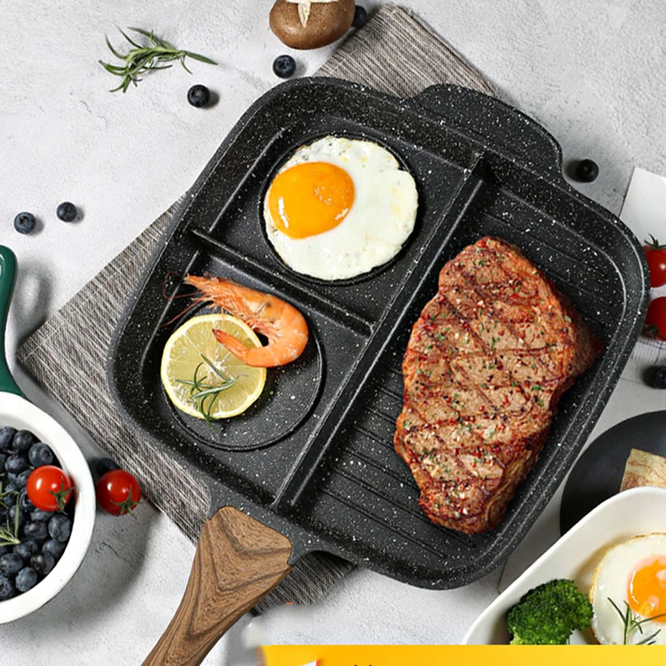 Сковорода для гриля с 3 отсеками для приготовления пищи (в том числе одна с рифленой поверхностью для гриля). Вы можете гриль сразу несколько ингредиентов, вместо того, чтобы чистить кастрюлю каждый раз, когда вы гриль один. Легко жарить ваш бекон, яйца, пепельно-коричневый и многое другое отдельно, не оставляя большой кучу кастрюль для очистки. С помощью этой сковородки вы можете одновременно готовить до 5 различных продуктов. Он используется для приготовления различные различных блюд.
