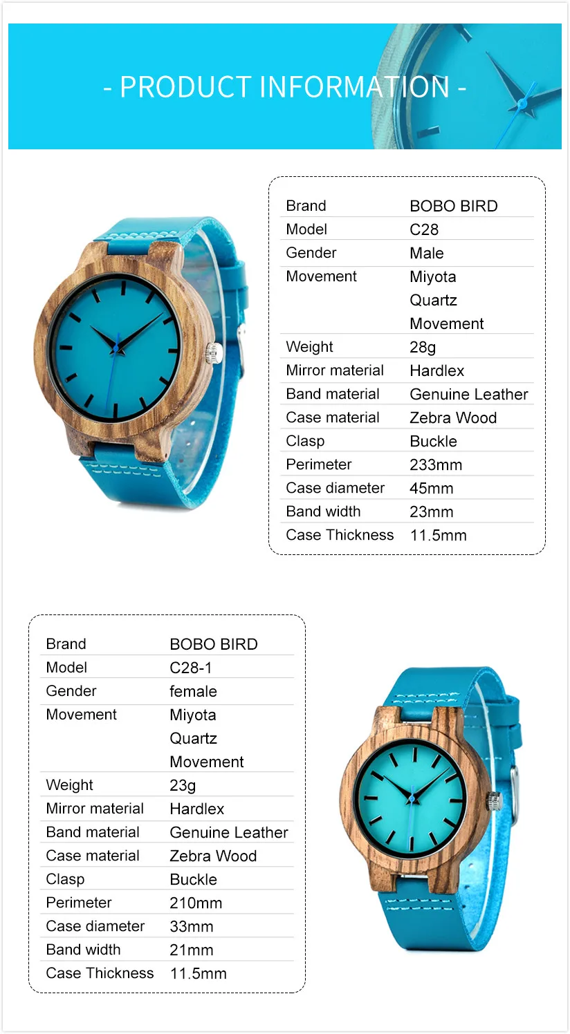 Description: Watch Brand: BOBO BIRD Model:A35+A36/M11+M12/N20+F29/C28+C28-1 Watch Type: Wooden Couple Wristwatches Warranty Time:1 Year Package: 2* BOBOBIRD Wooden Watch 1* Gift Watch Box