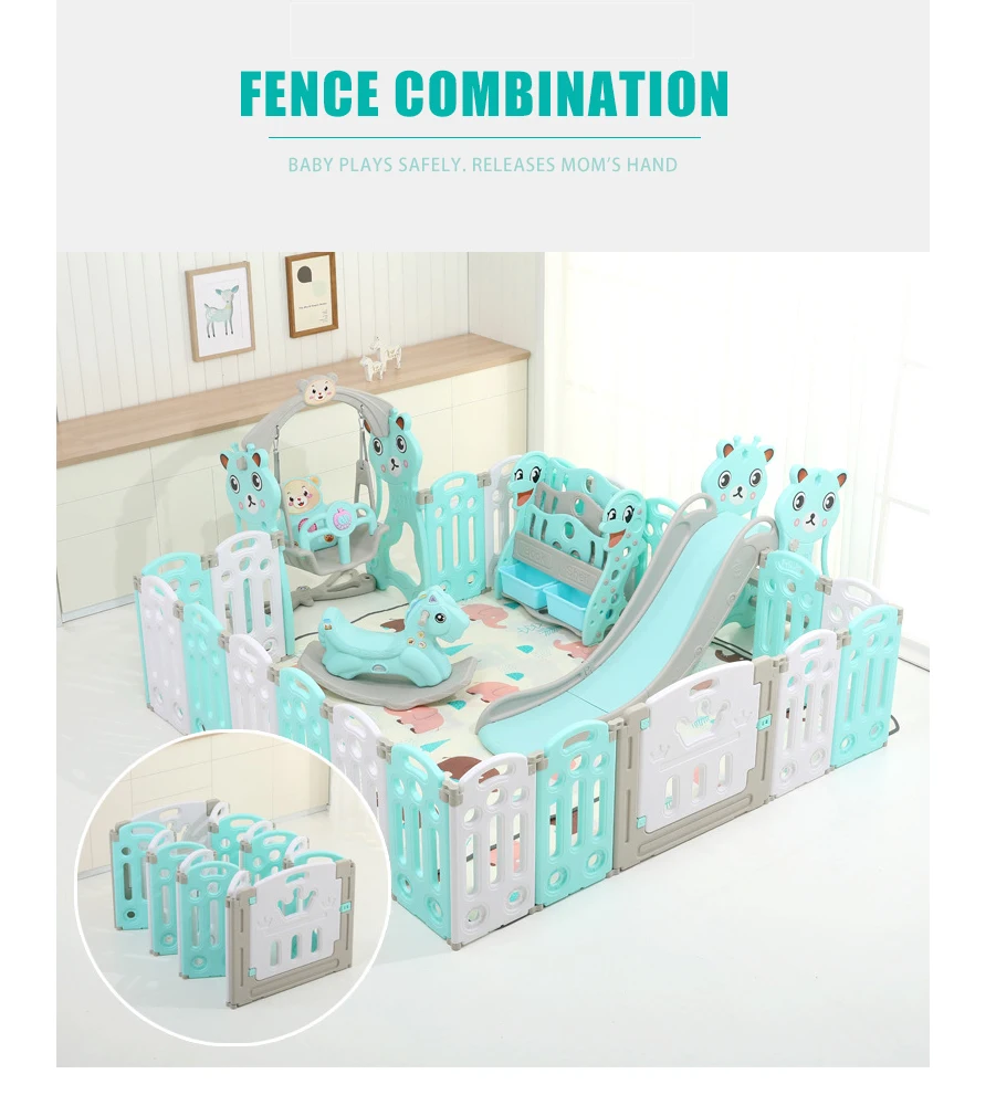 Размер комбинации забора: Роскошная комбинация 1: 1 шт. горка + 1 шт. лошадка-качалка + 1 шт. коврик + 18 шт. забор + 1 шт. дверной забор Внутренний диаметр: 180 см * 177 см Внешний диаметр: 235 см * 177 см Комбинация 2: Музыкальные качели + лошадка-качалка + коврик + забор + дверной забор Внутренний диаметр: 174 см * 177 см Внешний диаметр: 229 см * 177 см Комбинация 3: горка + лошадка-качалка + книжная полка + коврик + забор + дверной забор Внутренний диаметр: 208 см * 211 см Внешний диаметр: 263 см * 266 см