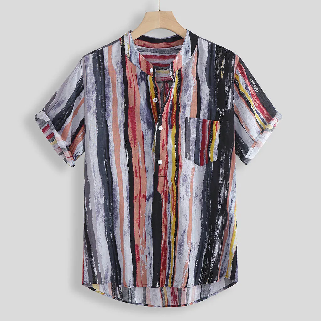 Мужская Летняя мода стоячий воротник полоса печати короткий рукав рубашка Топ