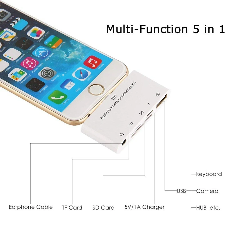 5 в 1 8-контактный адаптер для sd-камеры USB, OTG, 3,5 мм аудио разъем, TF SD Micro-Reader, комплект подключения для iPhone и iPad, портативный SD M