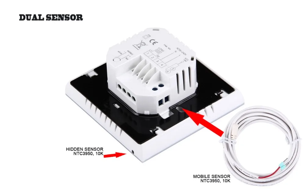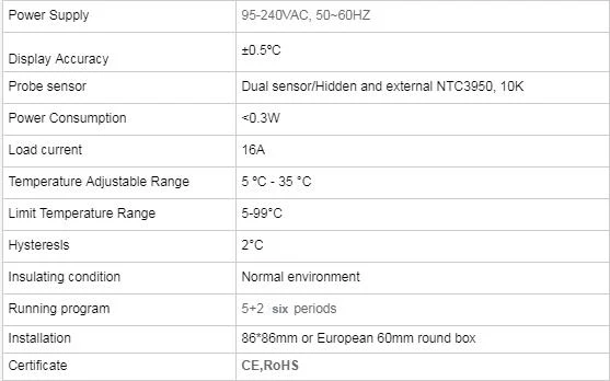 1 * термостат 1*2,5 м внешний датчик 2 * крепежные винты 1 * Руководство пользователя для термостата (на английском языке)