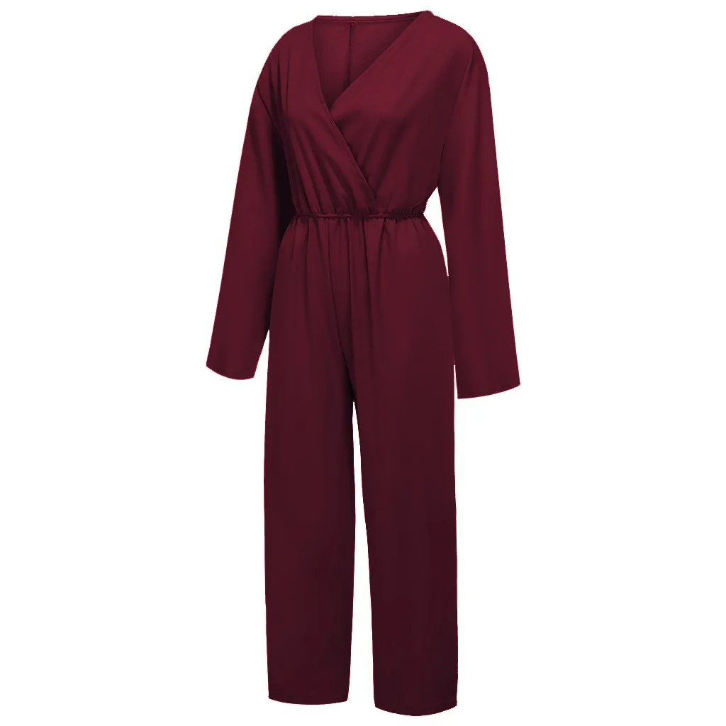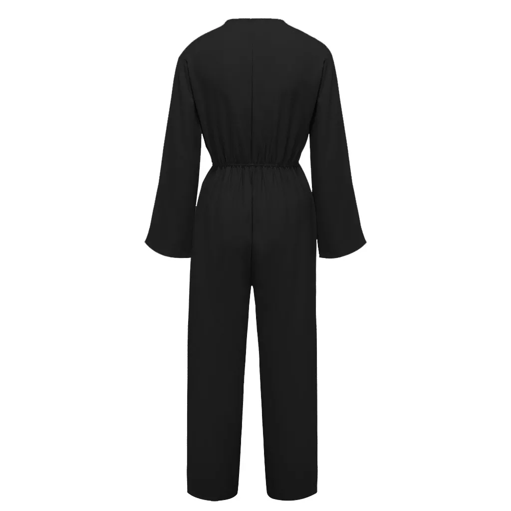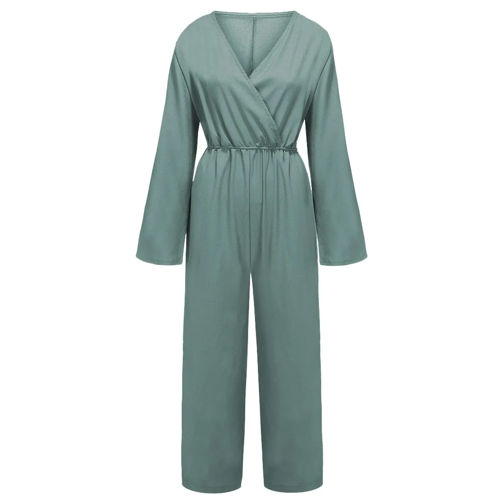 Autumn Women's Solid Color Long Sleeve V Neck Leather Band Waist Casual Jumpsuit