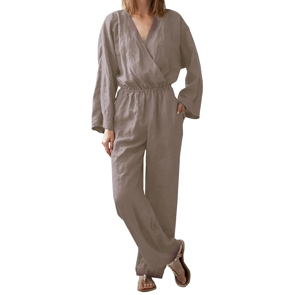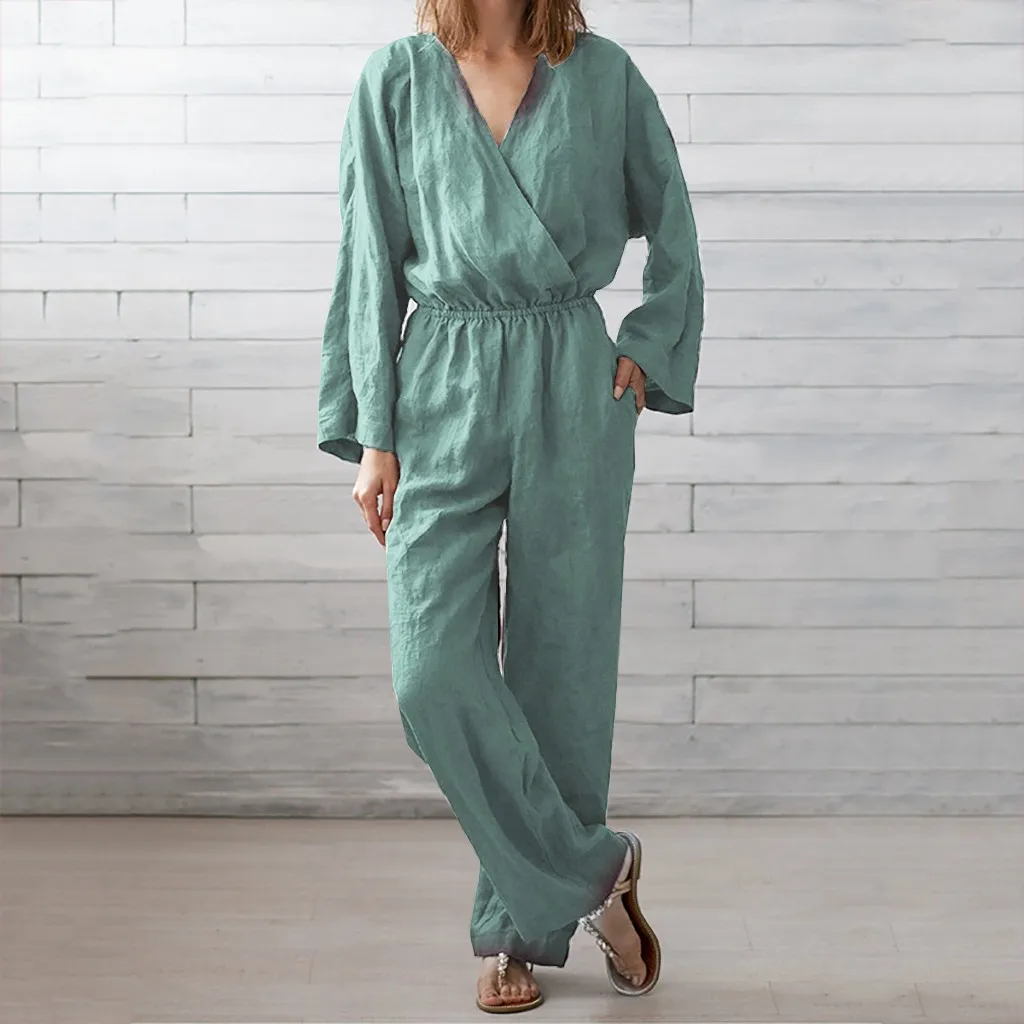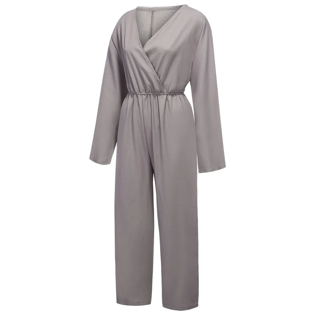 Autumn Women's Solid Color Long Sleeve V Neck Leather Band Waist Casual Jumpsuit