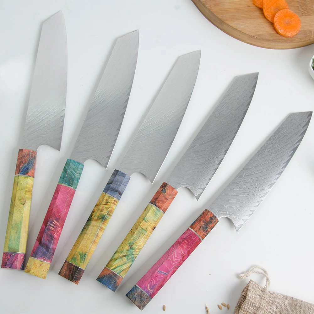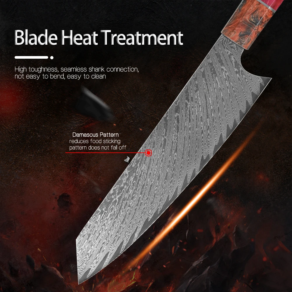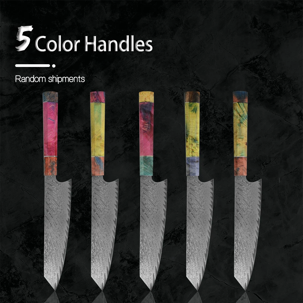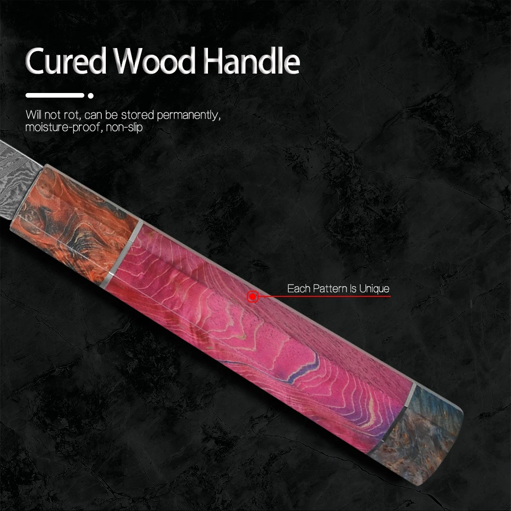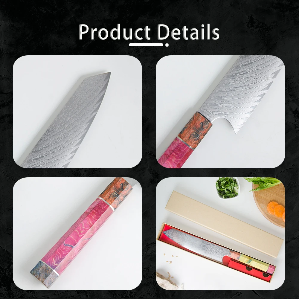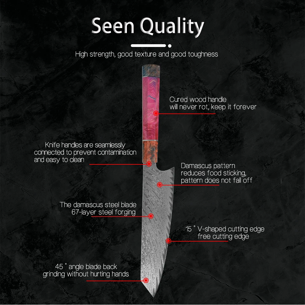 Суперострое лезвие мастерски изготовлено из 67 слоев VG-10 японской высокоуглеродистой нержавеющей стали обеспечивает исключительную прочность, долговечность и устойчивость к пятнам. V-Glod 10 японский супер стальной режущий сердечник на 62 + Твердость Rockwell. Кухонный нож, изготовленный с VG10, имеет лучшую прочность, удержание, остроту.