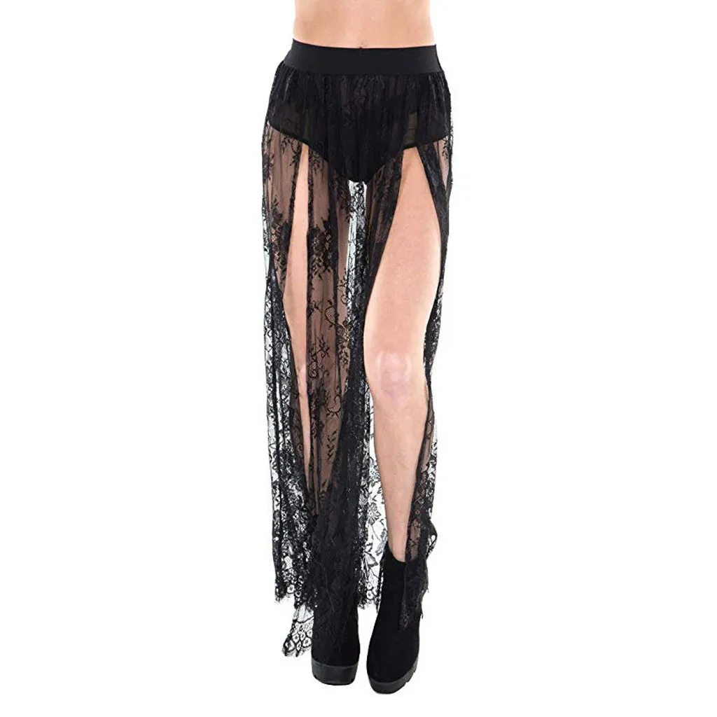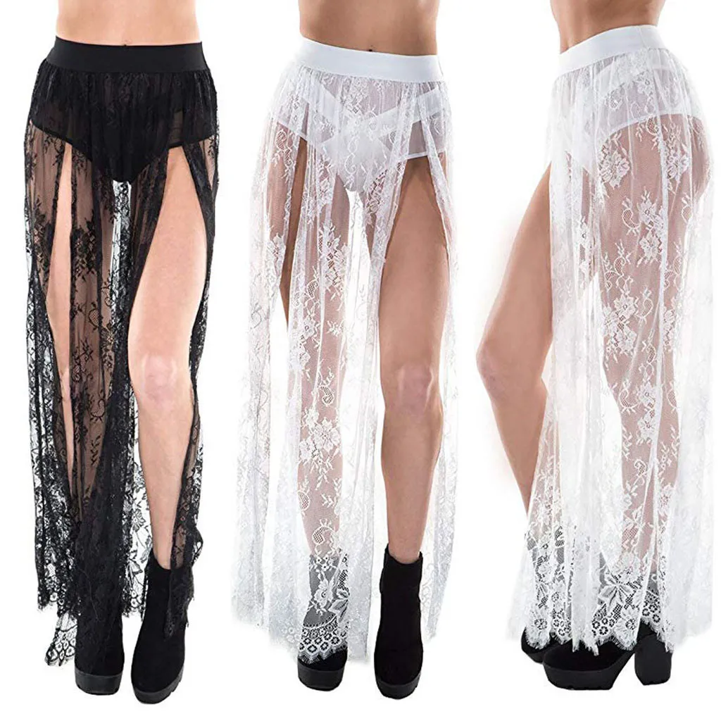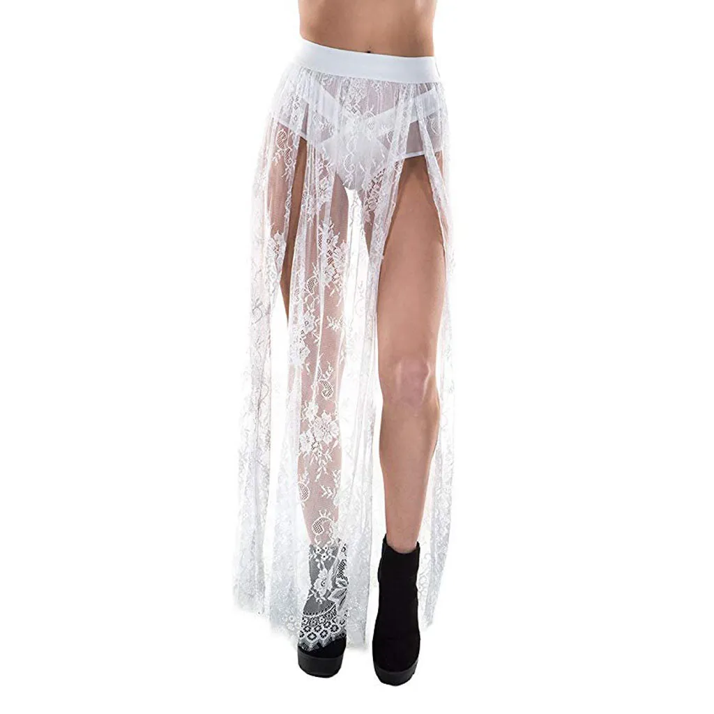 Женская длинная прозрачная сетчатая юбка макси с эластичным поясом и разрезом сбоку, пикантная пляжная юбка на шнуровке