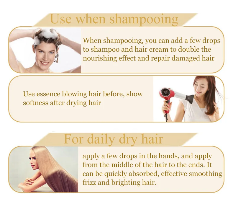 При мытье волос нанесите несколько капель на шампунь, увлажняющую маску или маску для волос, чтобы двойной эффект питания и восстановить поврежденные волосы. Используется в сочетании с волосами перед выдувом, волосы после сушки яркие и эластичные.