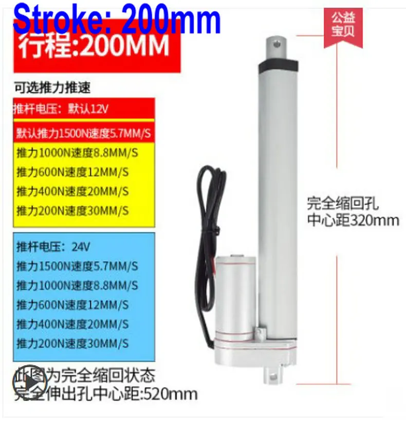 Ход поршня: 200 мм Максимальная тяга: 1500N Число оборотов холостого хода: 5,7 мм/сек. Концевой выключатель: Встроенный Частота использования (ED): 10% ED Уровень защиты: IP54 Температура рабочей среды: -25 ℃ ~ 75 ℃