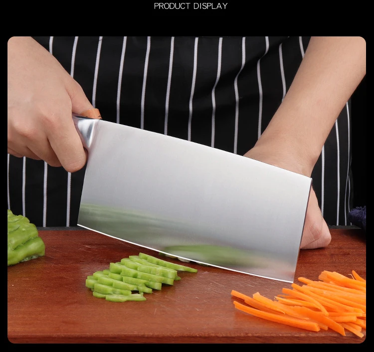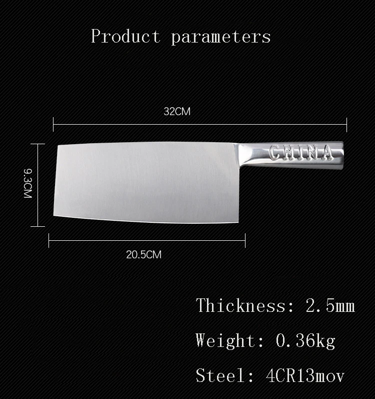 Название: кухонный нож Материал лезвия: нержавеющая сталь 4Cr13Mov Материал ручки: дерево Размер лезвия: 205x93x2,5 мм, Длина ножа: 320 мм Толщина лезвия: 2,5 мм Твердость лезвия: 57 ± 2 HRC Применение: нарезка мяса/овощей/приготовленной еды/лосося/рыбы, очистки уток/рыбы и т. Д. Применение: острый, антикоррозийный, высокая твердость, долговечность Вес: 0,36 кг Упаковка: коробка