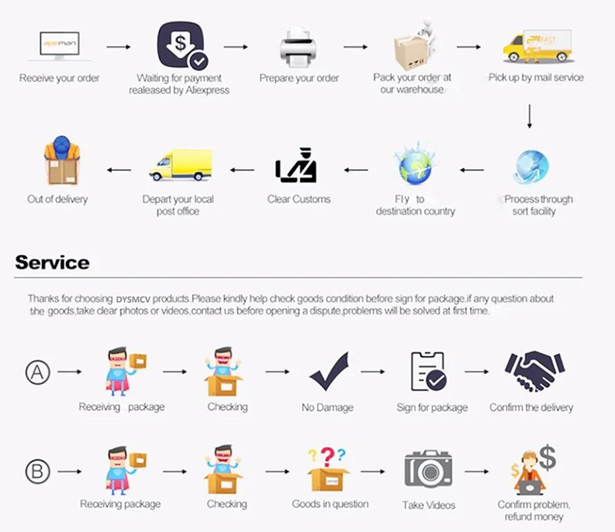Что касается послепродажного обслуживания, если вы столкнулись с некоторыми проблемами, когда вы получили посылка, пожалуйста, свяжитесь с нами как можно скорее, мы постараемся сделать все возможное, чтобы найти идеальное решение для вас! Мы будем очень признательны, если вы последуете за нашим магазином или дадите пять звезд. Спасибо!