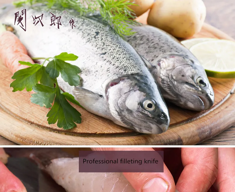 Нож изготовлен из 4Cr13 легированной стали, острый прочный, антикоррозийный балд, удобная ручка, вы можете использовать его для резки мяса, овощей, рыбы, сашими и т. Д.