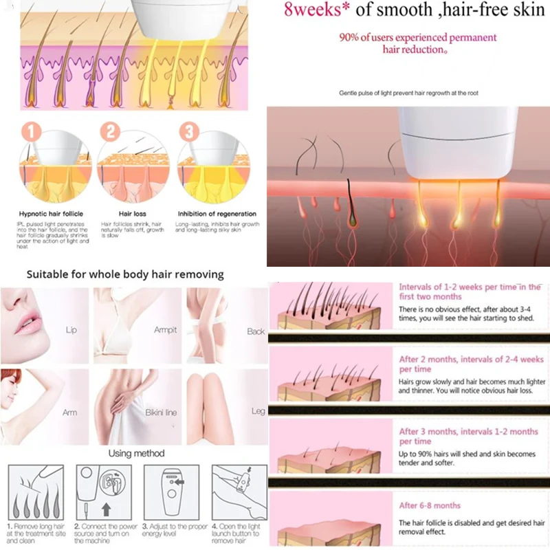 Клинические данные показывают, что 75% роста волос было подавлено после 4 недель использования устройства для удаления волос. 95% роста волос было эффективно подавлено, и волосы в основном не восстанавливаются после 8 недель использования. После 12 недель вам не придется регулярно обращаться, просто Попрощайтесь с повторным выпадением волос.