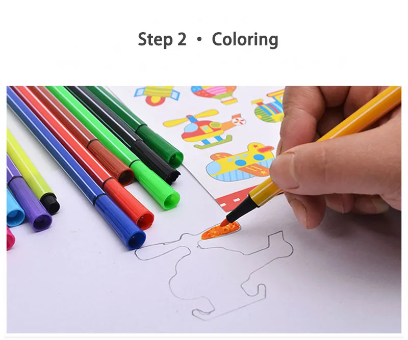 2. Изделие содержит: 32 цветных планшета, 12 акварельных ручек, 1 карандаш, 1 точилка, одну копию книги с рисунками, одну справочную картинку, одну коробку с ручкой для хранения.