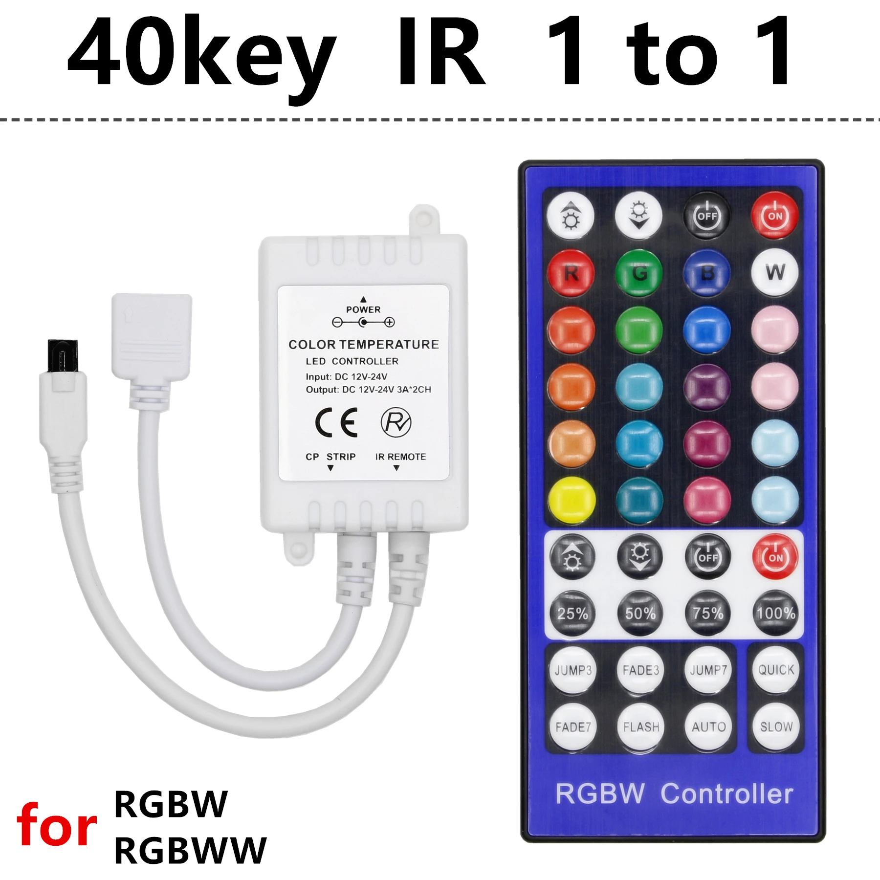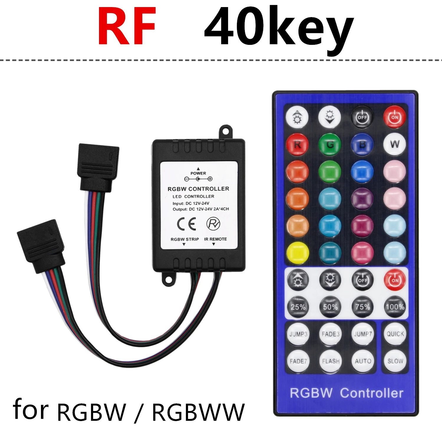 Этот RGBW контроллер разделен на RGB и W две части, его можно включить/выключить RGB часть и W часть самостоятельно, и может контролировать их яркость и цвет самостоятельно. Например, при включении RGB части, она может изменить цвет и яркость RGB части; И может включить W части в то же время, И может включать/выключать часть W или регулировать ее яркость. Когда на 3/7 Цвет выцветает модель, можно регулировать их скорость изменения; Когда на 3/7 Режим скачка цвета, можно регулировать их яркость и регулировать скорость изменения. 40-ключ инфракрасный контроллер принимает расширенный микро блок управления, он используется для управления различные лампы, источник светильник, светодиодный. Например, точечный светильник, гибкий светильник, настенный светильник со стеклянными занавесками и т. Д. Он имеет множество преимуществ, таких как низкая цена, простота подключения и простота использования. Между тем, вы можете настроить яркость, выбор статического цвета, настроить любой цвет и различные динамические изменения световых эффектов через инфракрасный пульт дистанционного управления. Характеристики: Напряжение питания: DC12V-24V Выход: 4 канала Режим подключения: общий анод Статическая Потребляемая мощность: <1 Вт Выходной ток: 2А (каждый канал) Pacakge включает в себя:1 пульт дистанционного управления RGBW (аккумулятор CR2025 не входит в комплект)