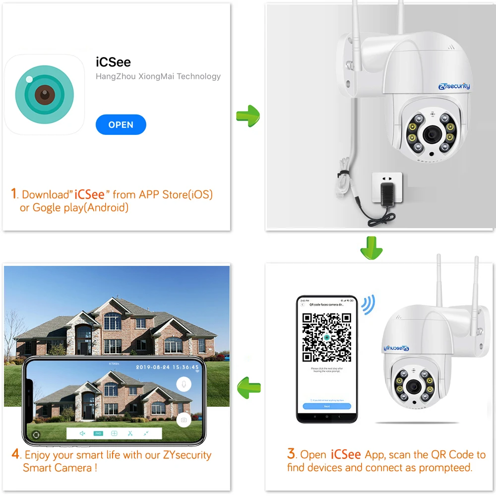 Ip-камера ZYsecurity поставляется с qr-кодом, который можно отсканировать с помощью мобильного устройства с помощью нашего бесплатного приложения iCSee (iOs и Android). Эту беспроводную камеру можно легко и быстро настроить.