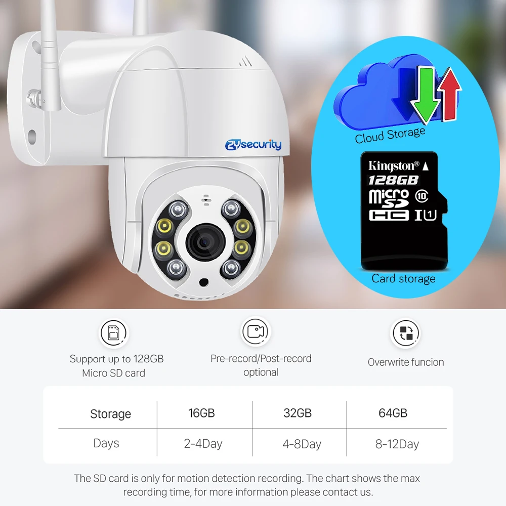 Дружественная облачная служба может хранить безопасные данные, даже если камера повреждена или украдена, вы можете войти в приложение телефона, чтобы мгновенно проверить ваши кадры. Домашняя камера безопасности ZYsecurity поддерживает sd-карту памяти до 128 ГБ. Также она поддерживает onvif recorder с технологией smart H.265, она может экономить более 5 раз больше памяти, чем другие камеры.