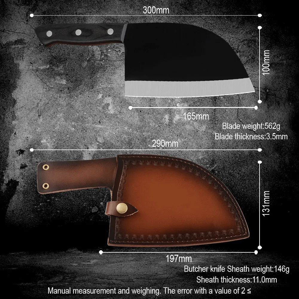 Вес ножа: около 562 г Ширина лезвия: около 100 мм Длина лезвия: около 165 мм Толщина лезвия: около 3,5 мм Стиль ручки: полная ручка Tang Материал лезвия: высокоуглеродистая Нержавеющая сталь 7cr17 ручной работы Материал ручки: полностью интегрированный Стальной хвостовик + дерево + заклепки Материал оболочки: кожа, нейлон