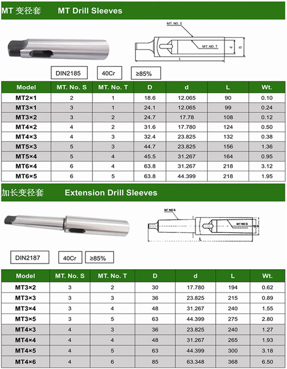 1 шт. адаптер конус Морзе 45 # сталь 50 HRC конус Морзе адаптер MT1-MT2 MT2-MT3 MT3-MT4 MT1-MT3 MT2-MT4 MT1-MT4 уменьшающий рукав Особенности: 100% новый товар высокого качества. Изготовлен из высококачественной стали 45 #. Для использования конусного хвостовика Морзе, конусного хвостовика сверла с хвостовиком, reamers Reduction. Принимает общий процесс закалки, длительный срок службы, прочный, сильный ударопрочность. Высокая точность, внутри и снаружи очень гладкая. Легко хранить и поддерживать, очень полезно. Характеристики: Материал: сталь 45 # Точность: 0,015 мм Твердость: 50 HRC