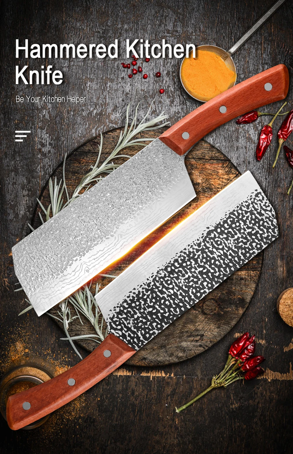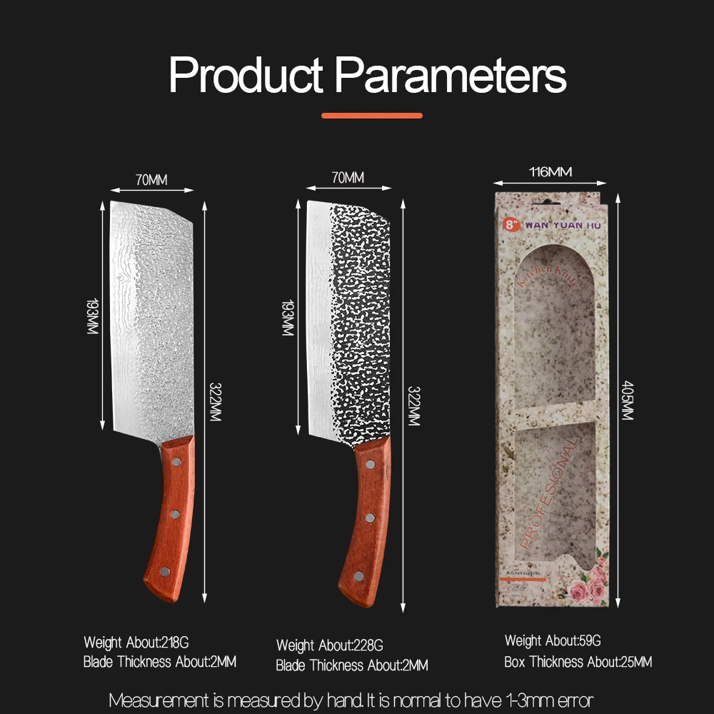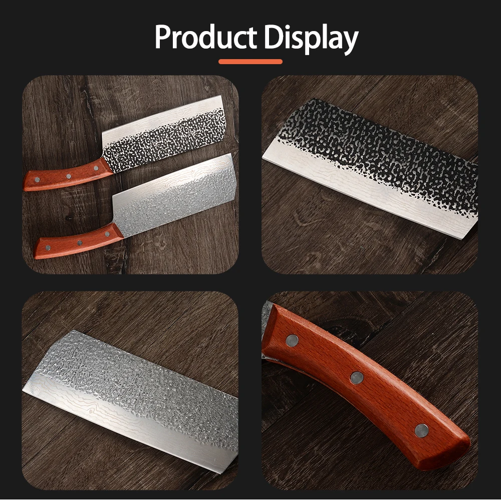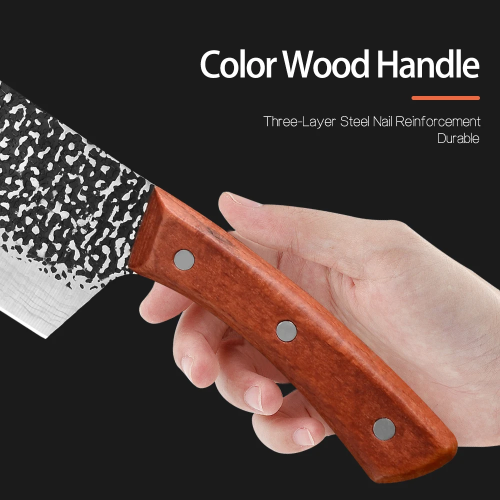 Material:Manganese Steel Quenching Splash: 780 Degrees Tempering :180 Degrees - 200 Degrees Material : Handmade Forged High-carbon Clad Steel Handle: Full Tang integrated steel shank + wood + rivet fixing Production Process: In The Quenching - Hammer -Tempering- Clamping Steel - Hammer -Quenching- Tempering And Other Continuous Cycle Operations.