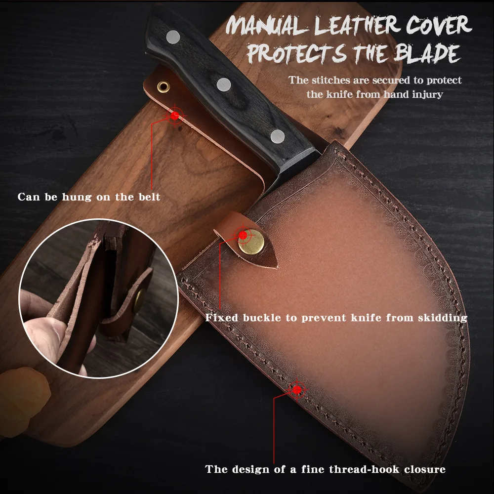 Ширина лезвия: 105 мм Длина лезвия: 165 мм Толщина лезвия: 5 мм Стиль ручки: полная ручка Tang Материал лезвия: нержавеющая сталь 7cr17 Материал ручки: полностью интегрированный Стальной хвостовик + дерево + заклепки