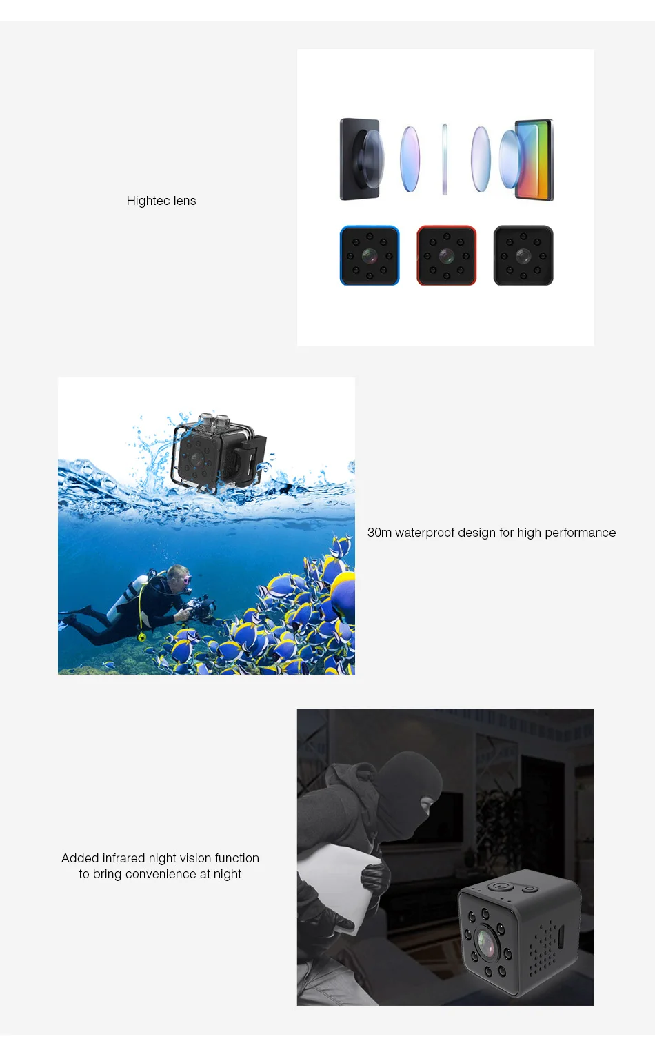 • 30 м водонепроницаемый дизайн для высокой производительности • Поддержка одновременной зарядки и записи • Функция инфракрасного ночного видения обеспечивает удобство в ночное время • Супер широкий угол обзора 155 градусов • Автономный Wifi для автоматического подключения к телефону