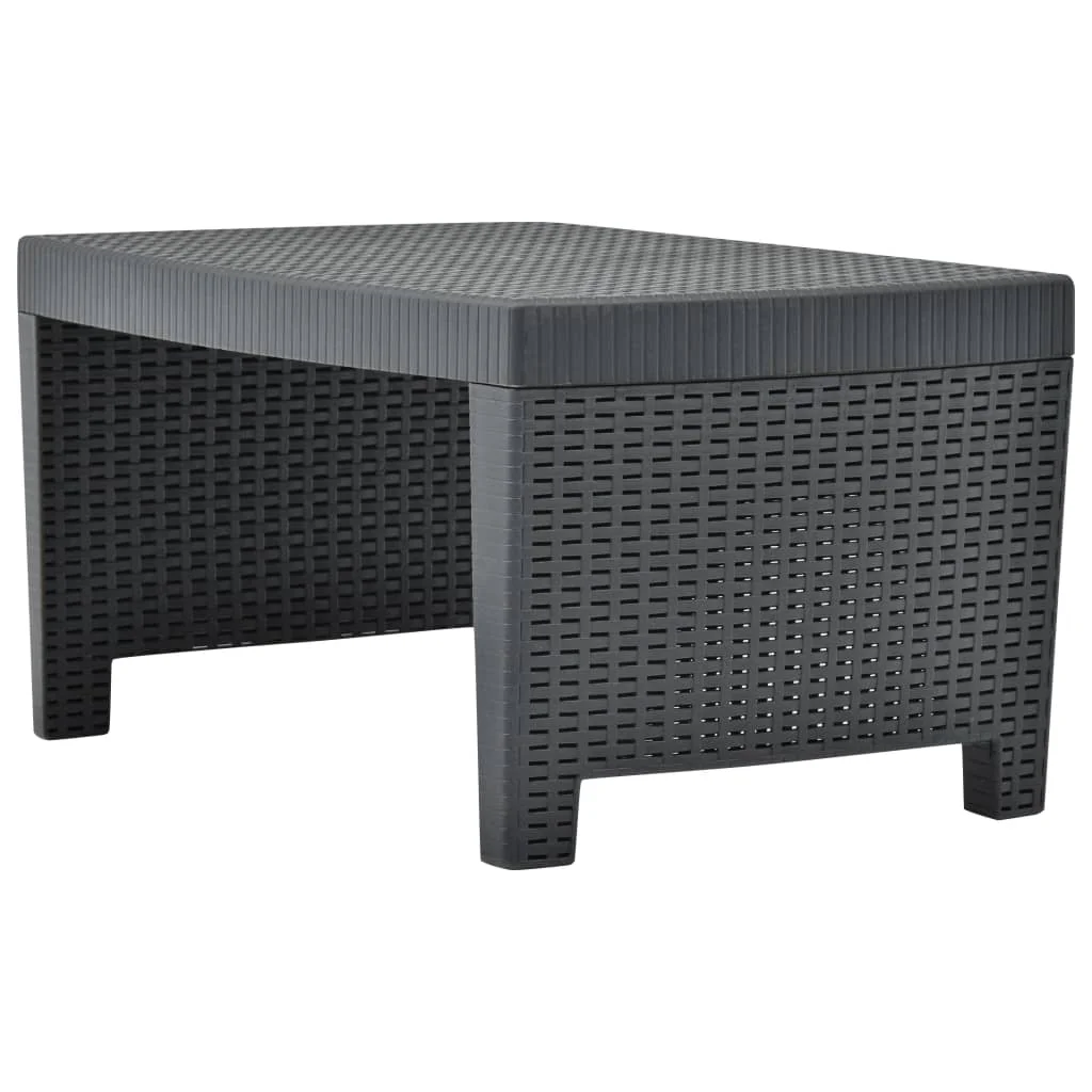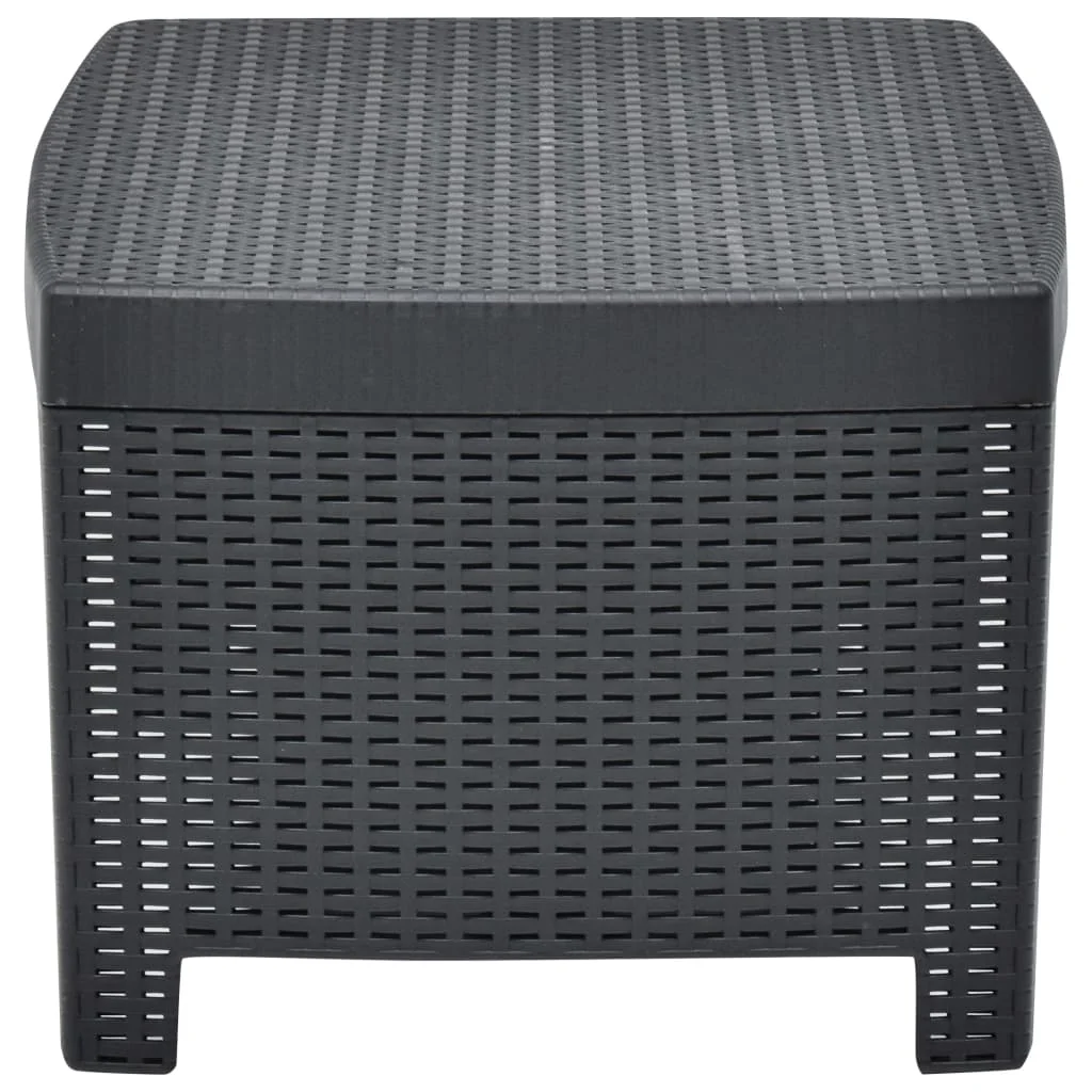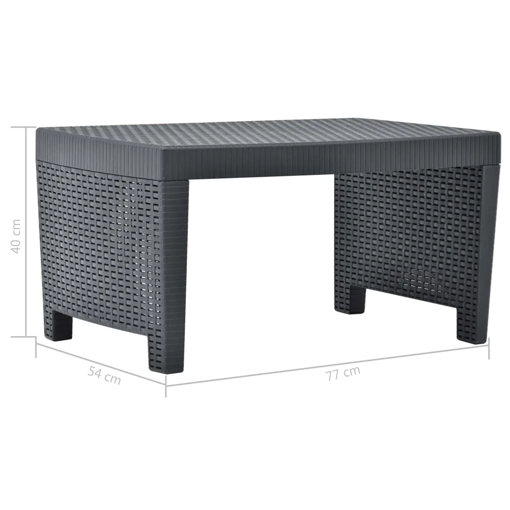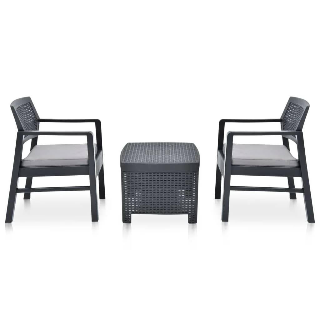 Цвет: Антрацит Материал: пластик Материал подушки: 100% полиэстер Размеры стола: 77x54x40 см (Д x Ш x В) Размеры стула: 63x59x75 см (Ш x Г x В) Ширина сиденья: 51 см Глубина сиденья: 51 см Высота сиденья от пола (без подушки сиденья): 35,5 см Высота подлокотника от земли: 58 см Толщина подушки: 4,5 см Устойчивость к погодным условиям В комплект поставки входит: 1 стол 2 x кресло 2 x подушка сиденья