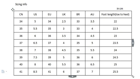Подсказка: Пожалуйста, выбирайте размер в соответствии с длиной Вашей стопы (от носка до пятки) и таблицей размеров. Спасибо!
