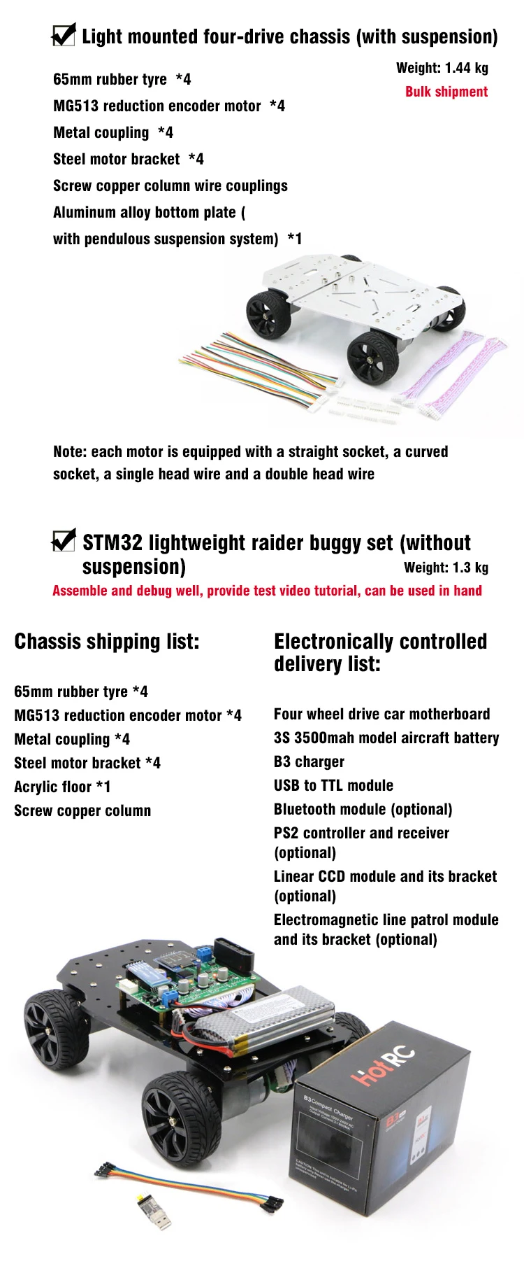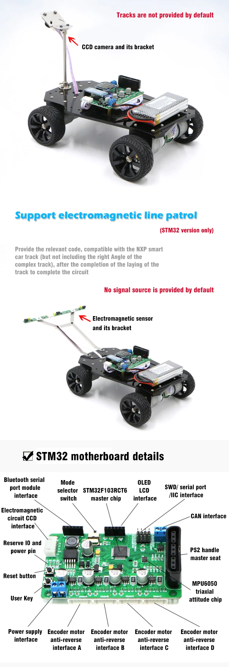 STM32 version defaults to CCD + electromagnetic line patrol module, PS2 + Bluetooth Arduino version is Bluetooth + PS2, without CCD + electromagnetic line patrol module