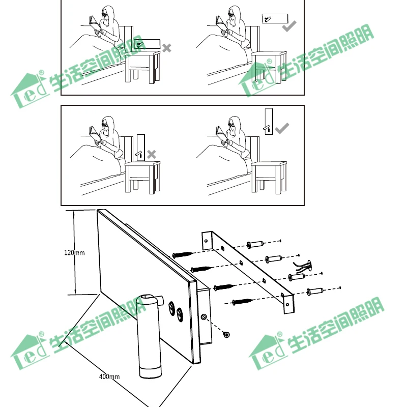 1. Двойные переключатели обеспечивают независимое управление светильник для чтения и задний светильник 2. 3 Вт светильник для чтения для акцентного светильник ing, 12 Вт светильник подсветки для окружающего светильник ing, Светильник цвета на выбор. 3. Светильник для чтения можно отрегулировать до 90 градусов. Наклон и 330deg. Вращение 4. Высококачественный эффективный светодиодный светильник обеспечивает комфортное освещение и стабильную эффективную работу без бликов, не вызывая усталость глаз. 5. Универсальный вольт AC100-240V, 200 лм + 1000 лм выход. 6. Хорошая конструкция-Тонкая матовая черная/белая отделка, невидимый Монтажный кронштейн и винты, аккуратные и элегантные. 7. Основание l400xw120mmxd30 мм, внутренний кронштейн для стены 360x80 мм, общая толщина 40 мм. Прожектор d30xl110мм. 8. Может быть установлен горизонтально или вертикально