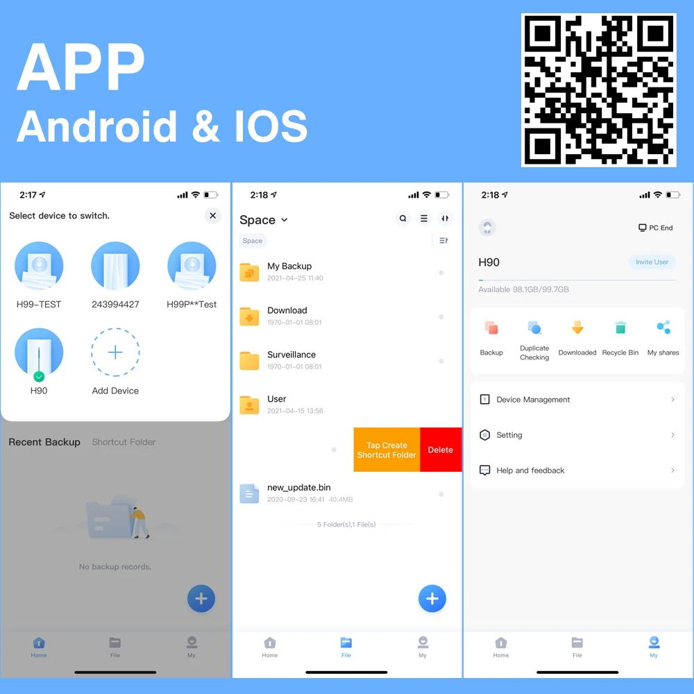 Designed for home and office,H100series NAS (Network Attached Storage) delivers multiple capabilitiesfor customers. It comes with two slots of 2.5-inch HDDs/SSDs, total storage capacity is up to 8 TB, automatic backup solution, and sufficient interfaces. Dual shock-resistant and intelligent heat dissipation features make NAS stable. Users can access and share files via APP anywhere anytime.