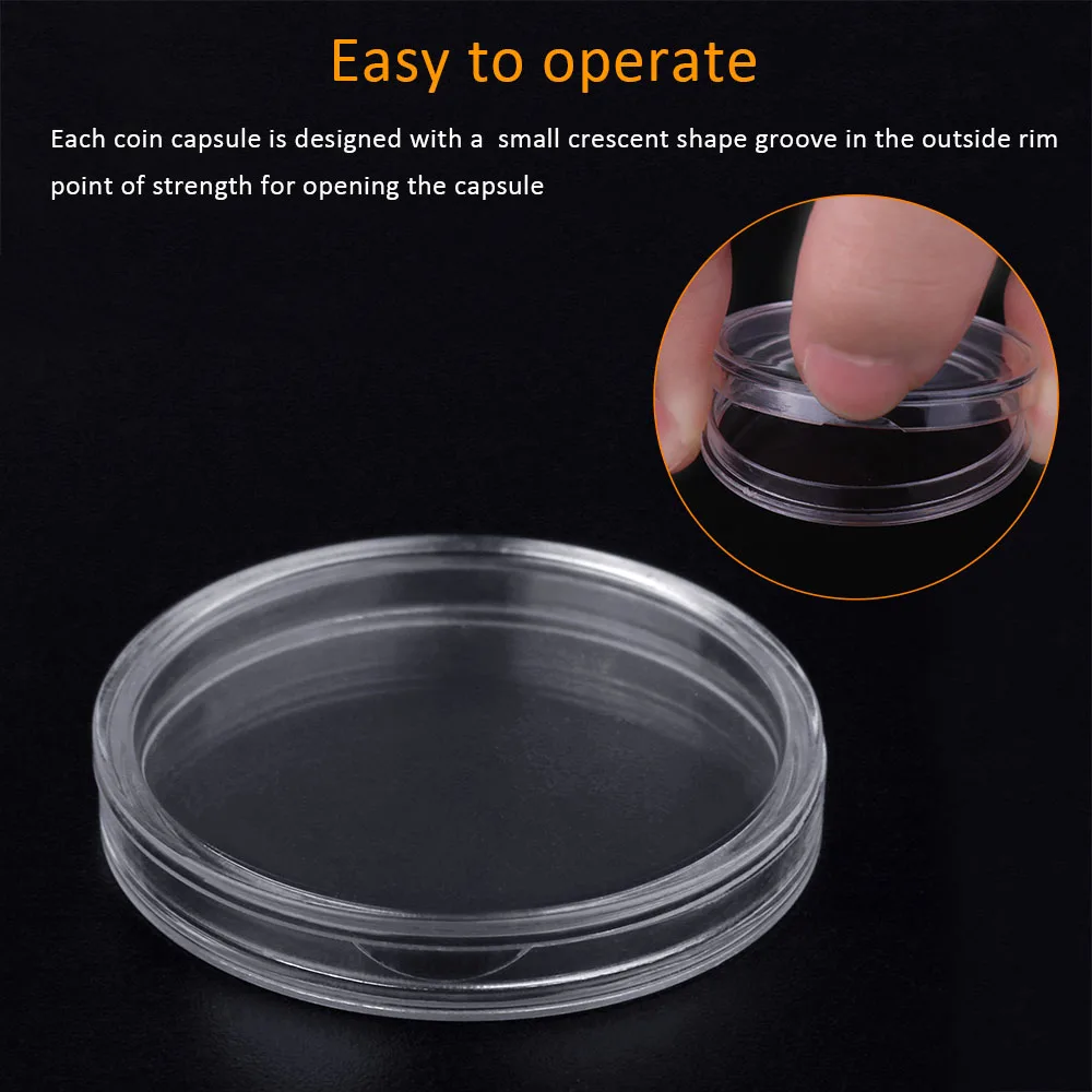 Каждая монетная капсула спроектирована с небольшим канавкой в форме полумесяца на внешнем ободе. Он идеально подходит для формы пальца и создает точку прочности для открытия капсулы. Капсула для хранения монет с гениальным дизайном полумесяца легко открывается, что более экономично и удобно.