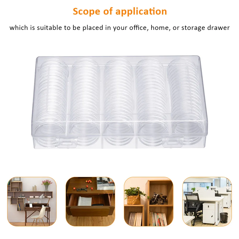 7,27*4,72 дюйма (Д * Ш) Монета коробка для хранения может содержать max 100 шт. монеты отлично предохранит ваше Монета Чехол желатиновых капсул, и не беспокойтесь, что они рассортированы и организованно. 100 шт капсулы для монет внутри коробки для хранения монет могут быть достаточны для вашей большой коллекции.