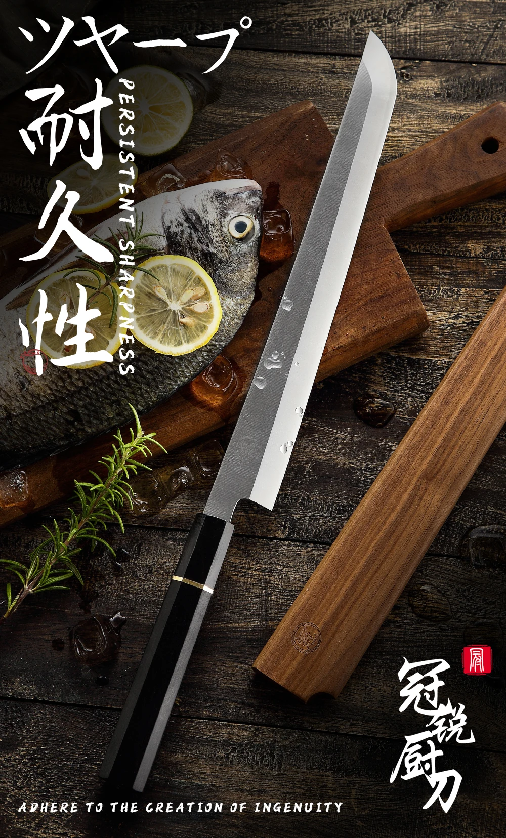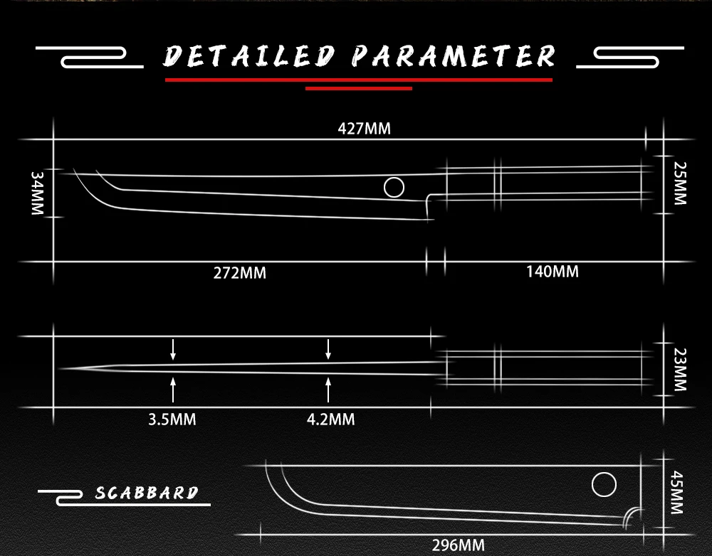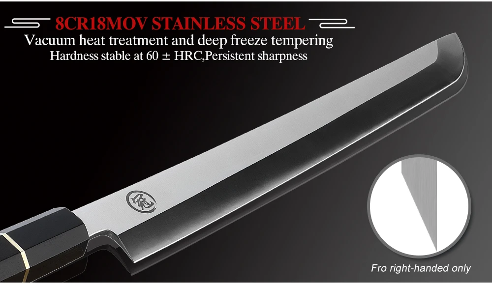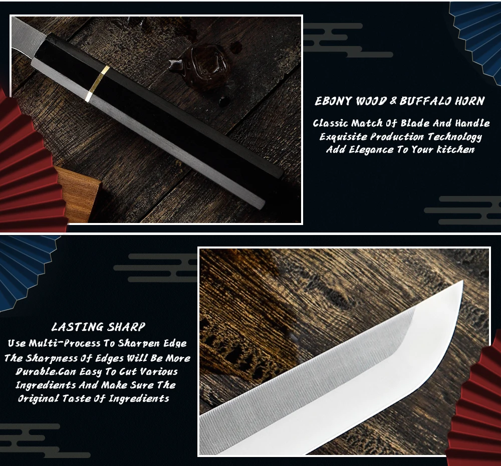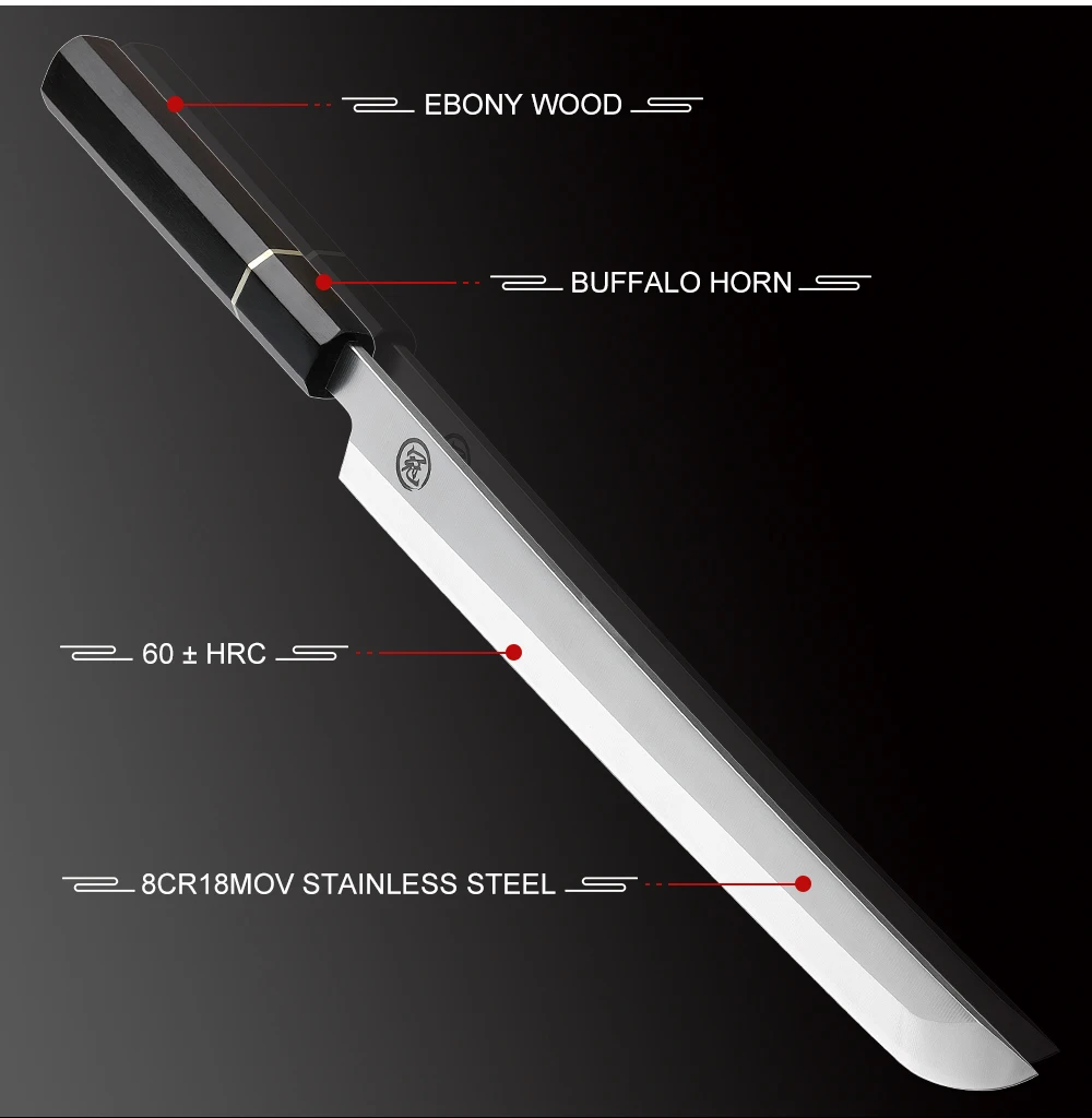Технические характеристикиЛезвие: 270 ммМатериал клинка: нержавеющая сталь 8cr18movОболочка: САЯМатериал рукоятки: черное дерево + рог буйволаТвердость: 60 HRCВес ножа: 267 г.Упаковка:1 * профессиональный нож Sakimaru1 * Подарочная коробка