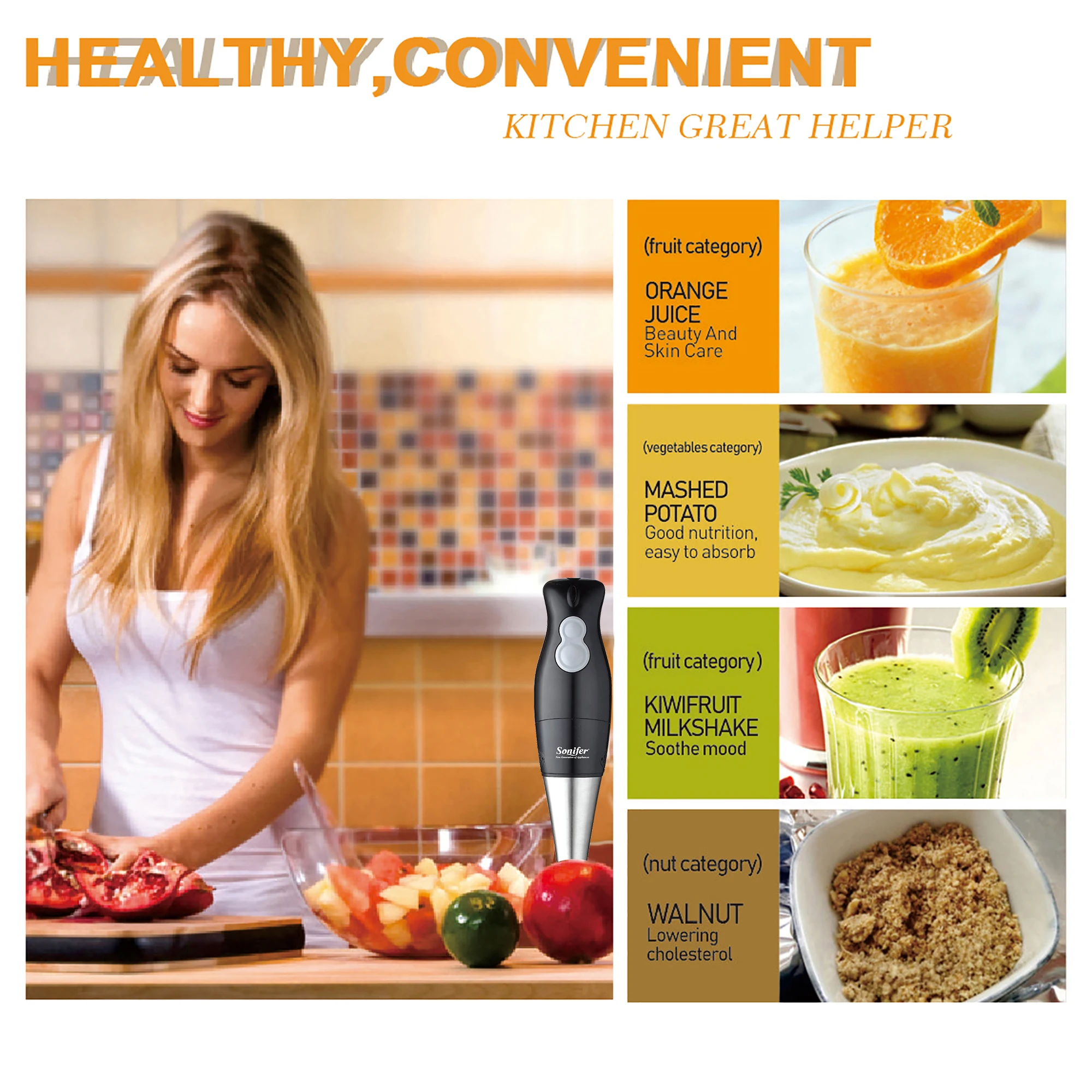 • Подходит для ручной блендер • 2 скорости • Черный/желтый • Стержень из нержавеющей стали • AC220 ~ 240 В, 50/60 Гц, 200 Вт