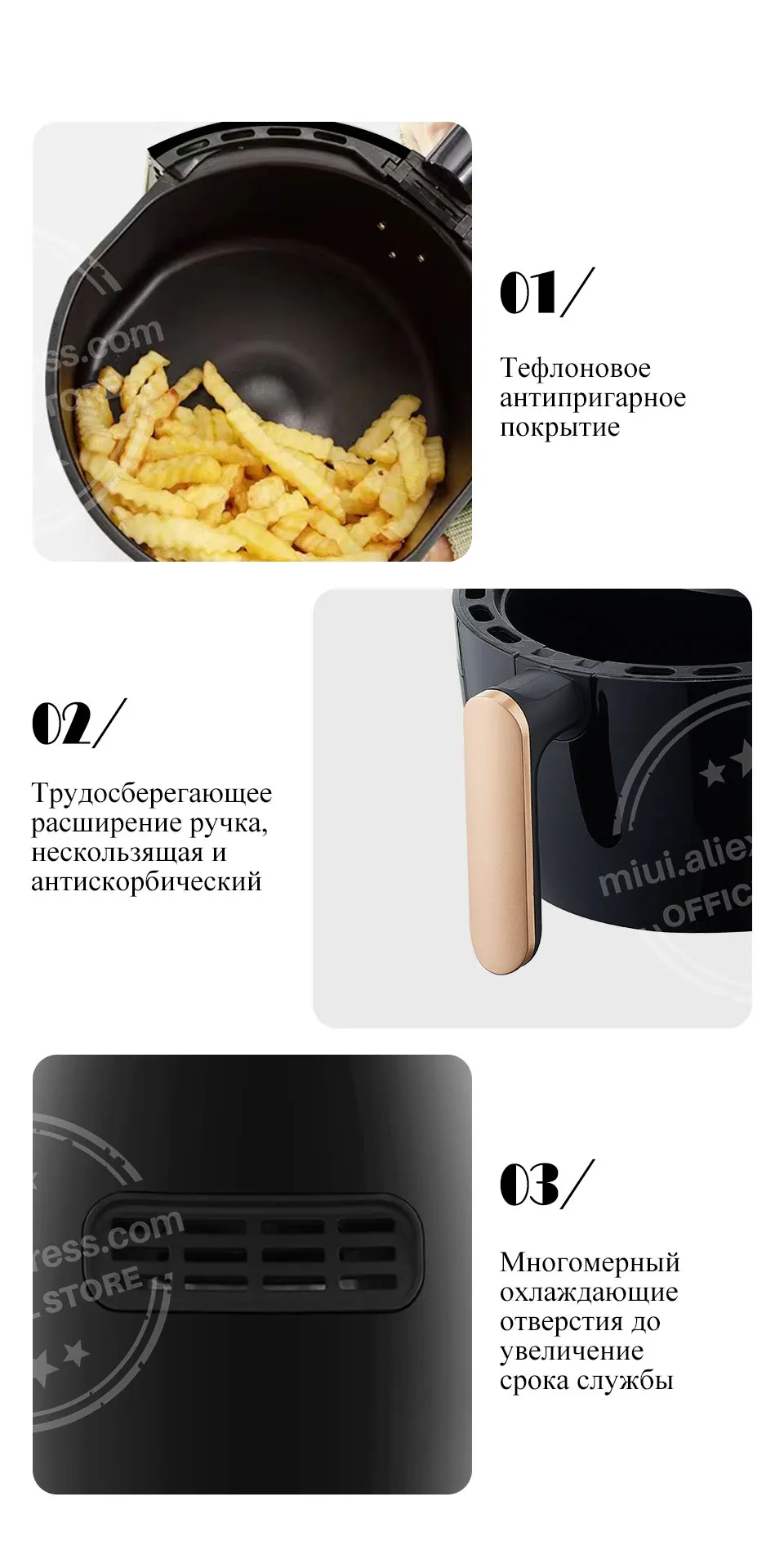 ● 【MIUI-TURBOSTAR фритюрница воздуха】Скоростная технология циркуляции воздуха может сбалансировать температуру нагревания, иметь сильное проникновение, и может эффективно готовить внутри еды; ● 【 360 Технология выпечки 】через встроенное турбинное ветровое колесо для равномерного приготовления на 360 градусов, циклонный поток горячего воздуха может равномерно жарить и жарить еду, быстро блокирует влагу, И сделать продукты свежими и сочными; ● 【Технология электростатической мембраны-Запатентованная технология электростатической мембраны может поглощать твердые частицы, образующиеся в процессе нагрева, эффективно избегая осадков и сжигания этих твердых частиц и влияя на вкус пищи; ● 【MIUI интимный дизайн 】 защита от скальпирования/Защита от сбоя питания/микроповоротное сенсорное устройство/бесшумный дизайн (менее 36 децибелов лабораторных данных) ● 【MIUI Высокое Качество 】 пищевое тефлоновое антипригарное покрытие (немецкое запатентованное покрытие whsi/немецкое y импортированное пищевое алюминиевое покрытие изоляционный слой полости)