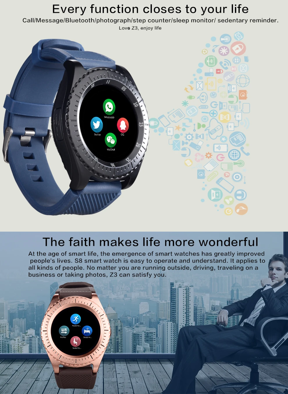 CPU: MTK6261D 360MHz SIM card: Only supports China Mobile and China Unicom cards Frequency: GSM 850/900/1800/1900 MHz Bluetooth: Bluetooth 3.0 Memory: 32M Storage: 32M External storage: Maximum support 32GB Screen size: 1.54 inches Screen category: TFT LCD Resolution: 240 x 240 pixels Camera: 80,000 pixels Music/Video: Support Picture format: JPEG, GIF, BMP, PNG Music format: MP3, WAV Video format: MP4 Bluetooth dialer: support Contacts: support Call reminder: support Clock: Support Anti-lost: support Pedometer: Support Sleep monitoring: support Sedentary reminder: support Calendar: Support Battery: 280 mAh Talk time: 3 hours Standby time: 180 hours SMS: Support USB interface: Mini USB interface Color: Black/Red/Blue/Silver/Gold Size: 43.5*40*11.8 (mm) Weight: 95 grams Gravity sensor: support Languages: English, French, Spanish, Portuguese, German, Russian, Italian, Arabic, Persian, Dutch, Czech, Greek, Hebrew, Filipino, Malaysian, Indonesian, Vietnamese , Thai, Burmese.