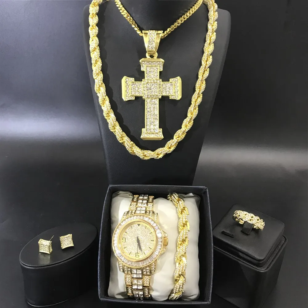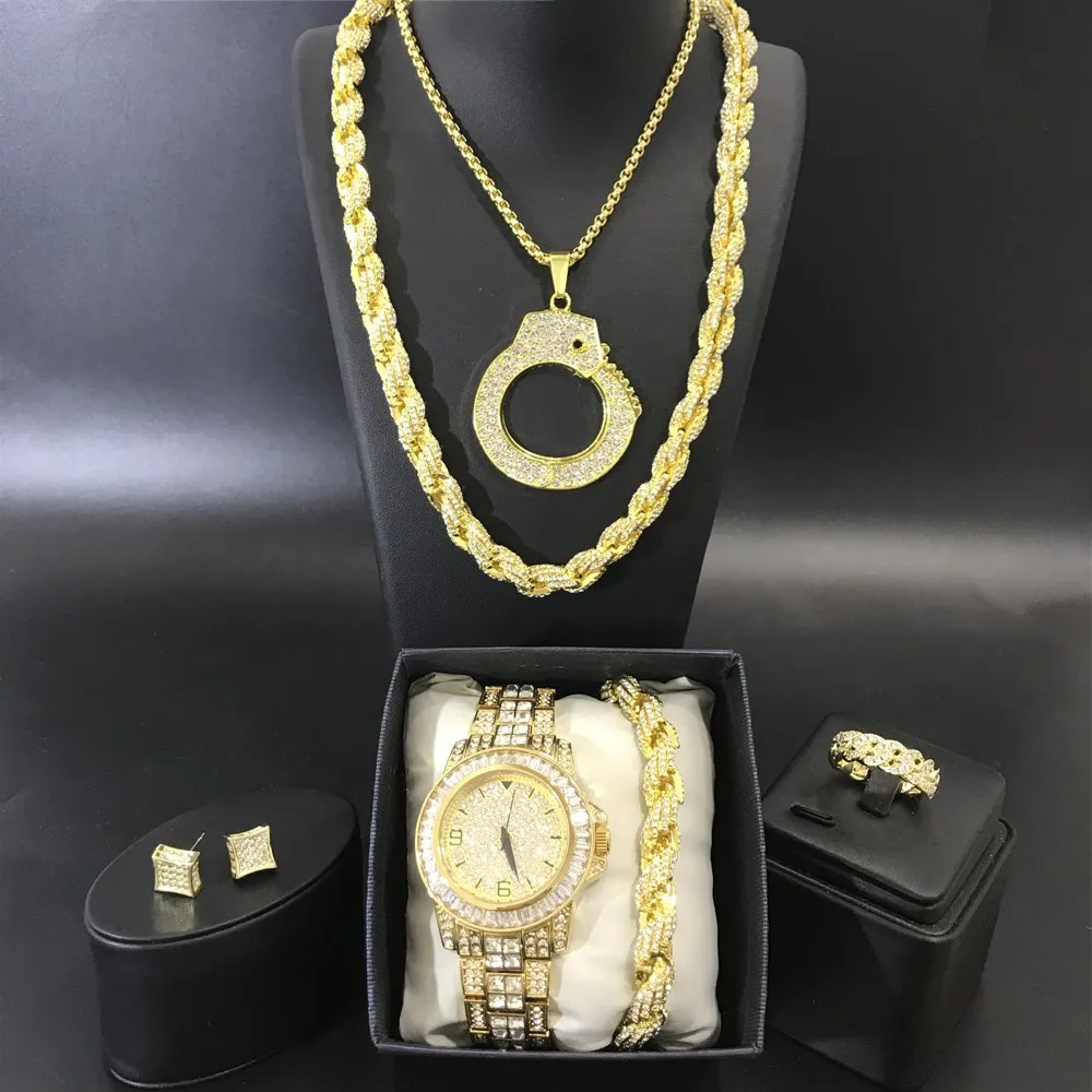 Часы: 100% Новый бренд Лабораторные алмазные камни на браслете Из нержавеющей стали Позолоченный Механизм: японский кварцевый механизм Батарея в комплекте Чехол Размеры: 43 мм (диаметр) Вес: 120 грамм Блокировки: двойной Пол: мужской/женский Съемные звенья (регулируемые) Фантазийном стиле Упаковочный лист Часы-1 шт. 1 * ожерелье 1 * умный Браслет 1 * Кольцо 1 * серьги 1 * Подарочная коробка в комплекте