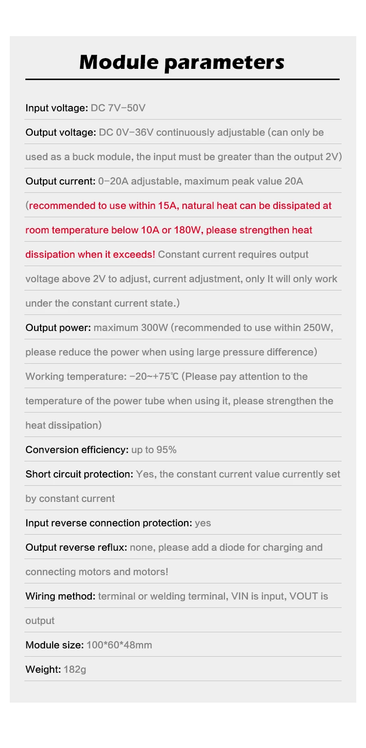 Калибровка напряжения: Без нагрузки, чехол выключен, нажмите и удерживайте кнопку «+», включите питание, введите режим калибровки напряжения, ЖК-экран начинает мигать, отпустите кнопку «+», нажмите кнопку «+», чтобы добавить, «-» для вычитания, Откалибруйте до правильного входного напряжения. Например, если Входное напряжение составляет 12,65 в, текущее напряжение будет отрегулировано до 12,65 в. Он будет автоматически сохранен через 2 секунды. После отключения питания калибровка завершена! Специальное примечание: Когда клиент только что получил ребенка, выходное напряжение не может быть изменено, потому что выходное напряжение по умолчанию составляет около 20 в, когда модуль отправляется с завода. Когда вы столкнулись с такой проблемой, поверните потенциометр CV против часовой стрелки для более чем 10 витков, пока значение напряжения не изменится, а затем используйте модуль для нормальной регулировки напряжения. Параметры модуля Входное напряжение: постоянный ток 7-50 в Выходное напряжение: постоянный ток 0-36 в постоянно регулируется (может использоваться только как модуль buck, вход должен быть больше, чем выход 2 В) Выходной ток: 0-20A регулируемый, максимальное пиковое значение 20A (рекомендуется использовать в течение 15A, естественное тепло может быть рассеивается при комнатной температуре ниже 10А или 180 Вт, пожалуйста, усиливайте тепловыделение, когда оно превышает! Для регулировки постоянного тока требуется выходное напряжение выше 2 в, Регулировка тока, только она будет работать только в режиме постоянного тока.) Выходная мощность: максимум 300 Вт (рекомендуется использовать в пределах 250 Вт, пожалуйста, уменьшите мощность при использовании большой разницы в давлении) Рабочая температура: -20 ~ + 75 градусов (обратите внимание на температуру трубки питания при использовании, если она превышает, пожалуйста, усиливайте тепловыделение) Эффективность преобразования: до 95% Защита от короткого замыкания: Да, значение постоянного тока в настоящее время устанавливается постоянным током Защита обратного подключения на входе: Да Выход обратного рефлюкса: нет, пожалуйста, добавьте диод для зарядки и подключения двигателей и двигателей! Доступно в нашем магазине! Метод проводки: терминал или сварочный терминал, вход VIN, выход VOUT Размер модуля: длина 100 мм ширина 60 мм высота 48 мм Вес: 182 г Диапазон применения Обратите внимание, что регулируемый ток постоянного тока должен находиться в режиме постоянного тока только тогда, когда фактический выходной ток нагрузки больше установленного тока, в противном случае он работает в состоянии постоянного напряжения, не ток регулируется на 2А, или любое устройство изменяется на 2А, также надеюсь на это. Постоянный ток выходного напряжения выше 2 в будет действовать! 1. Используется как обычный модуль buck с возможностью защиты от перегрузки по току (1) в условиях отсутствия нагрузки Отрегулируйте «потенциометр постоянного напряжения CV», чтобы выходное напряжение достигло желаемого значения напряжения; (2) Подключите нагрузку, подключите провод с толстой точкой, отрегулируйте «потенциометр постоянного тока CC» против часовой стрелки, завод по умолчанию 10 А, если фактическая потребность ниже, чем выход постоянного тока 10А, необходимо отрегулировать счетчик, дисплей ТОКА круга изменится. (Текущее значение, отобр