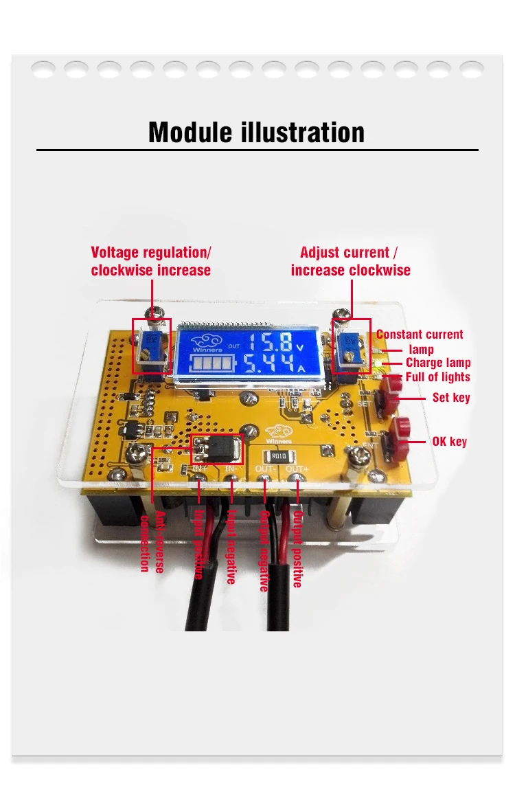 Примечание: когда покупатель только что получает ребенка, выходное напряжение не может быть отрегулировано, потому что выходное напряжение по умолчанию составляет около 20 в, когда модуль отправлен с завода. В тех случаях, когда вы столкнулись с этой проблемой, пожалуйста, включите ADJ-V потенциометр против часовой стрелки в течение более чем 10 оборотов до тех пор, пока напряжение изменения значения, а затем используйте модуль для регулировки напряжения в обычном режиме.