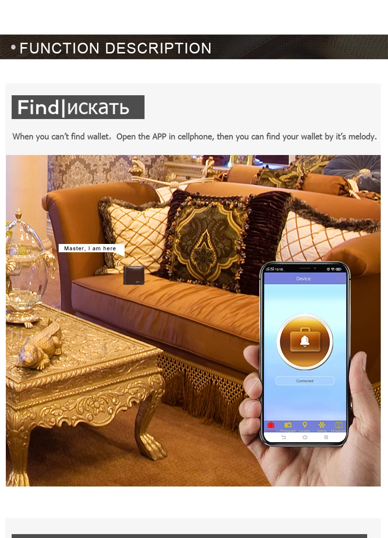 1. Вам нужно различить разницу между умным кошельком и обычным кошельком. 2. Умные кошельки и обычные кошельки изготовлены из той же кожи 3. Смарт-кошелек может быть подключен к мобильный телефон через Bluetooth, и имеет функции противоугонной, анти-потери и позиционирования. 4. Умный кошелек имеет встроенный литиевый аккумулятор, который можно заряжать с помощью usb-кабеля