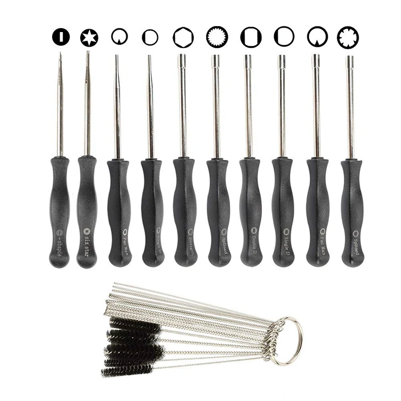 Набор для очистки-нейлон высокой плотности, хорошая эластичность, отсутствие выпадения волос, содержит 10 игл 5 кистей. Проволочная Обмотка из нержавеющей стали, антикоррозийная, гибкая ручка, без деформации.