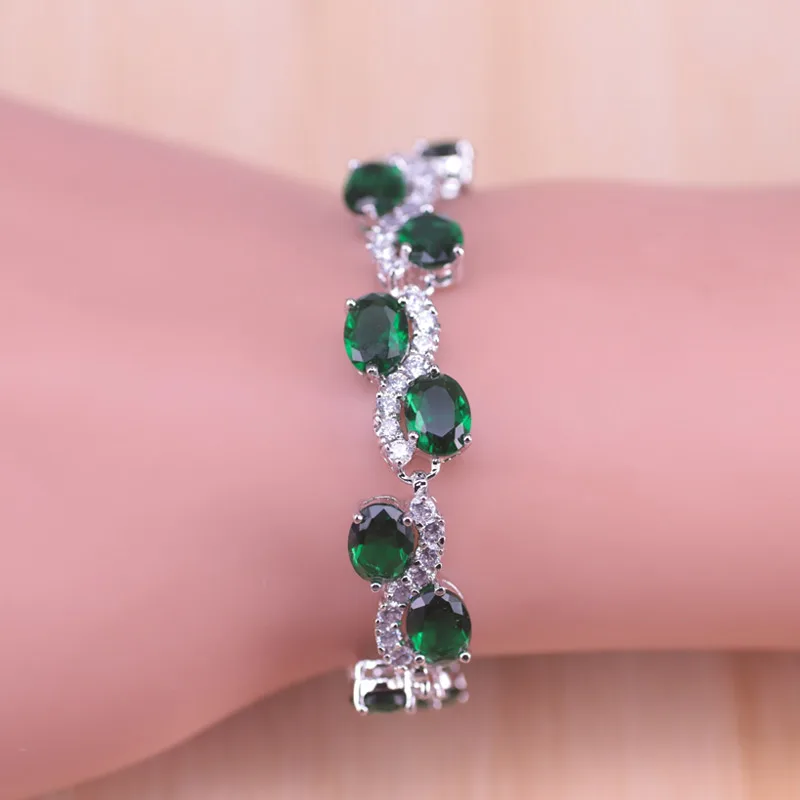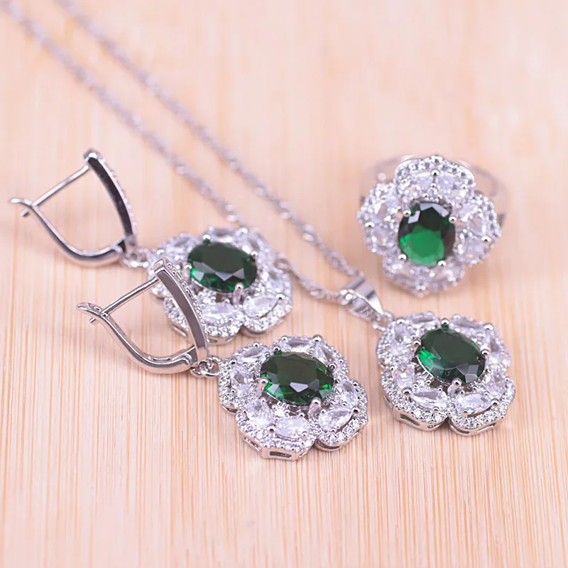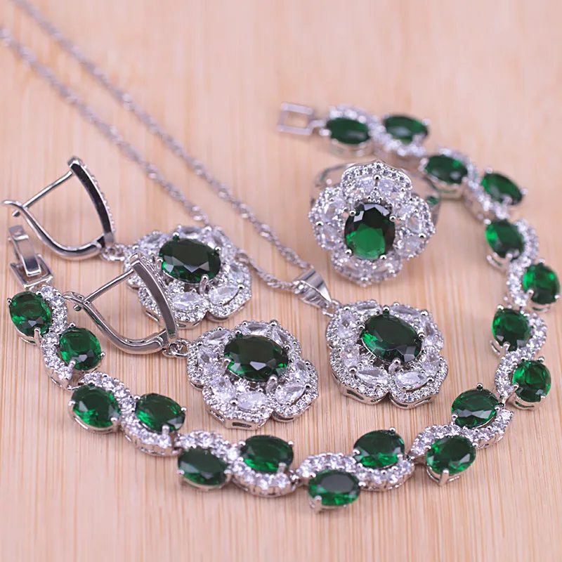 Русская Горячая Распродажа, Стильный серебряный цвет 925 пробы, зеленый камень, белый кристалл, костюм, свадебное ювелирное изделие, браслет, ожерелье, серьги, кольцо