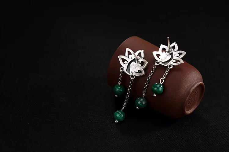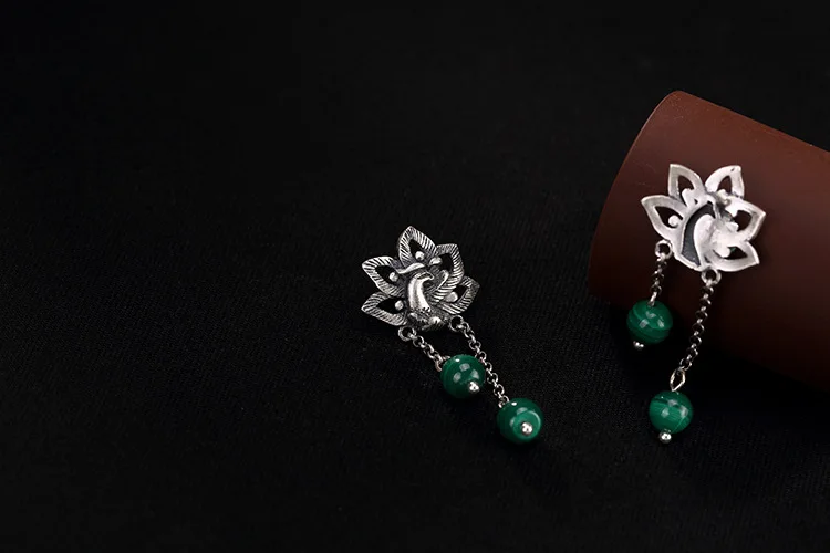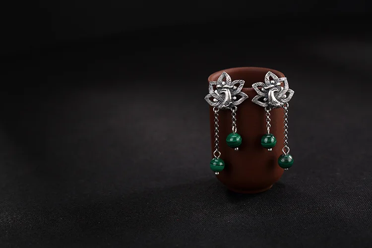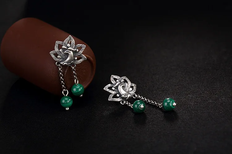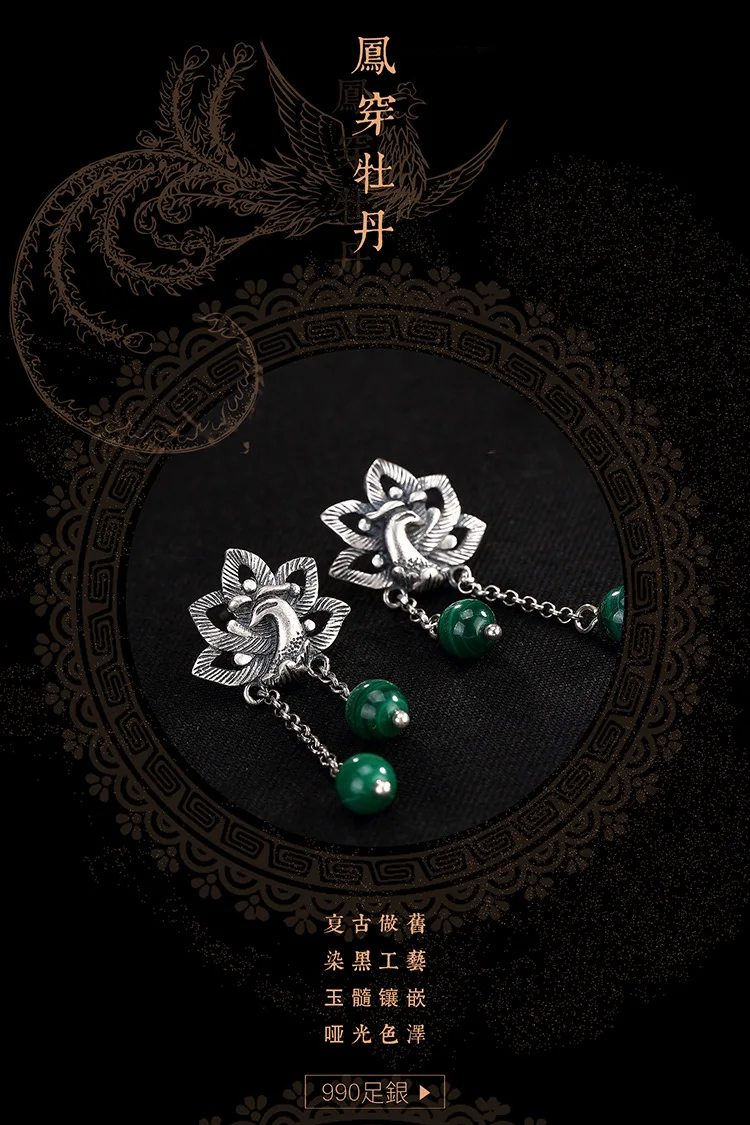 Советы: поскольку серебряные украшения ручной работы и нефрит производятся естественным образом, возможны незначительные различия в цвете и разница в весе. S990 серебряные РЕТРО МАТОВЫЕ Феникс носить пион малахитовые серьги дамы стерлингового серебра серьги оптом Материал: s990 серебро Серебряный Феникс: 20X18mm Вес: 11 г