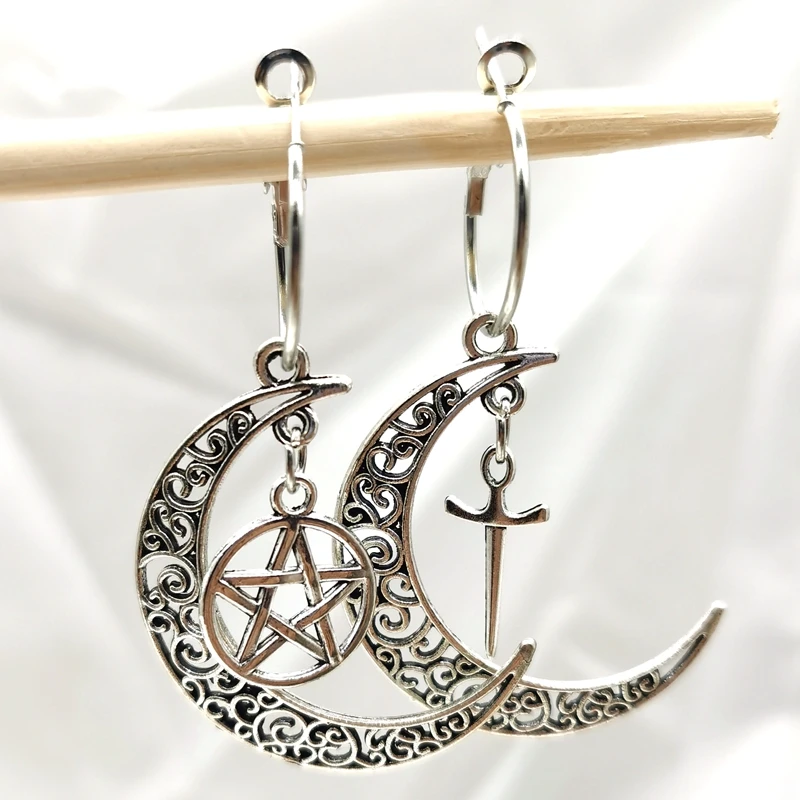 Серьги с пентаграммой и полумесяцем, серебряные серьги с Луной и звездой, языческие серьги с мечом, серьги с волшебной палочкой, луна с пентаграммой