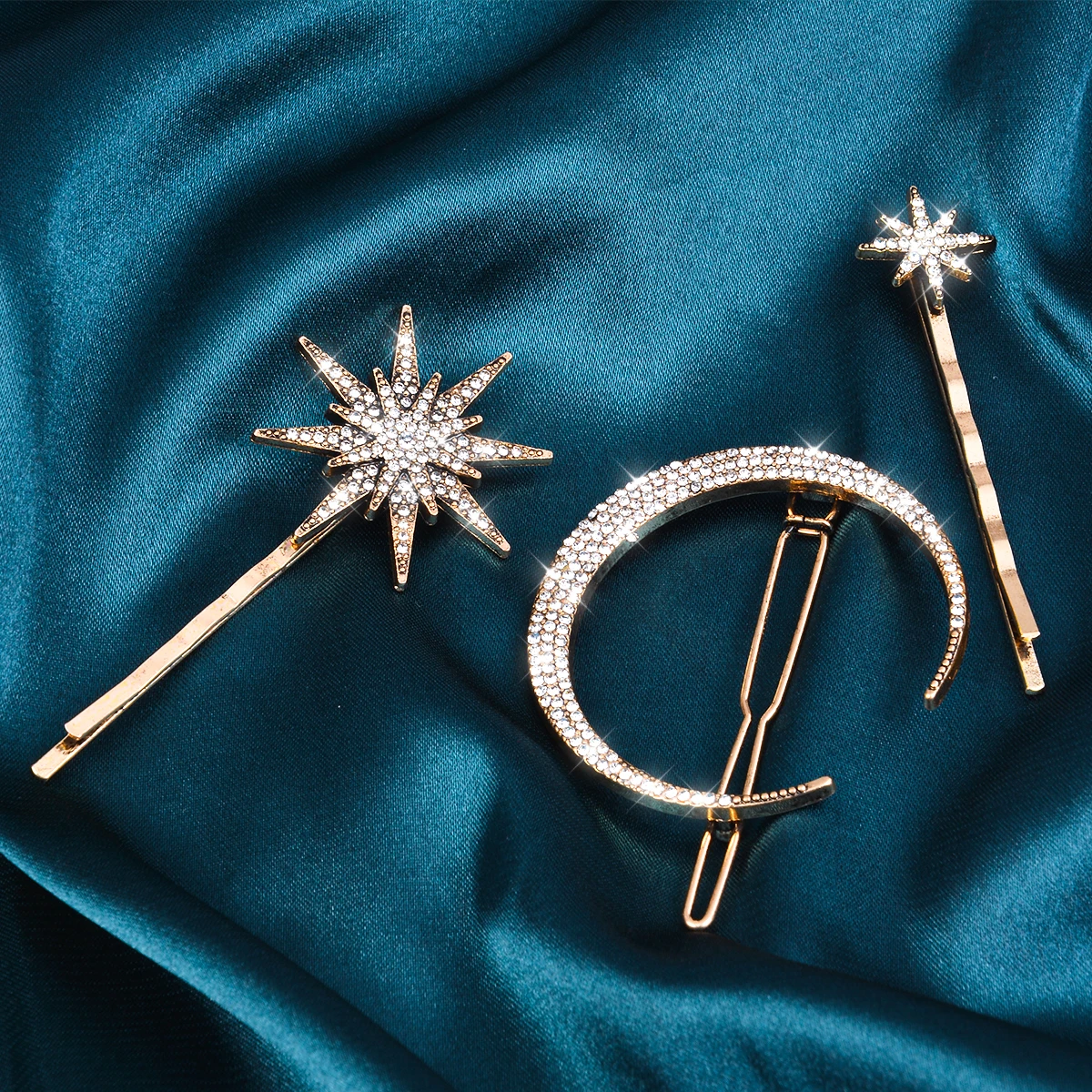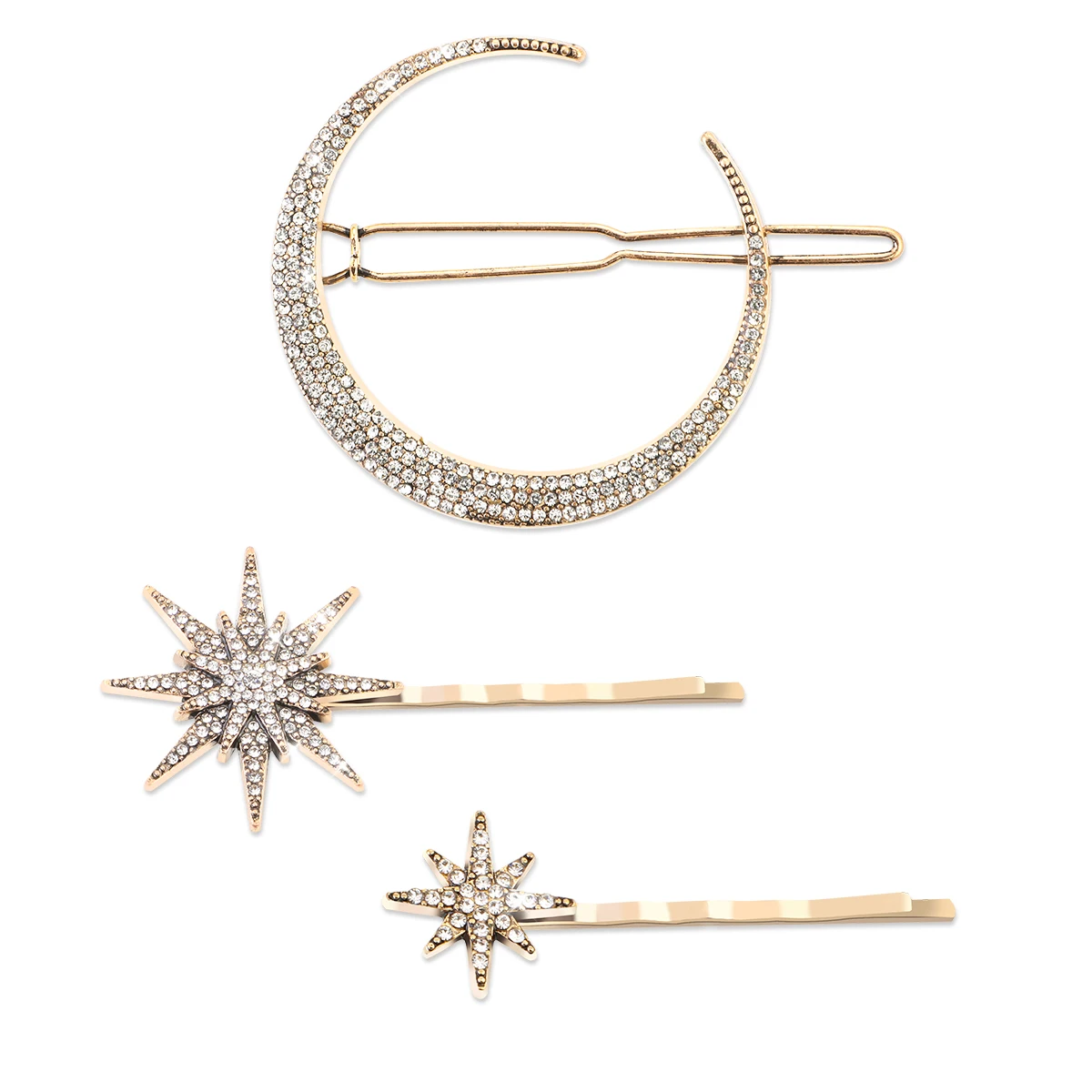 Stars and Moon Hair Clips Vintage Rhinestone (3 Pieces),Package includes: you will receive 3 pieces alloy hair clips, including 1 piece moon hair clips, 1 piece big star hair clips and 1 piece small star hair clip.