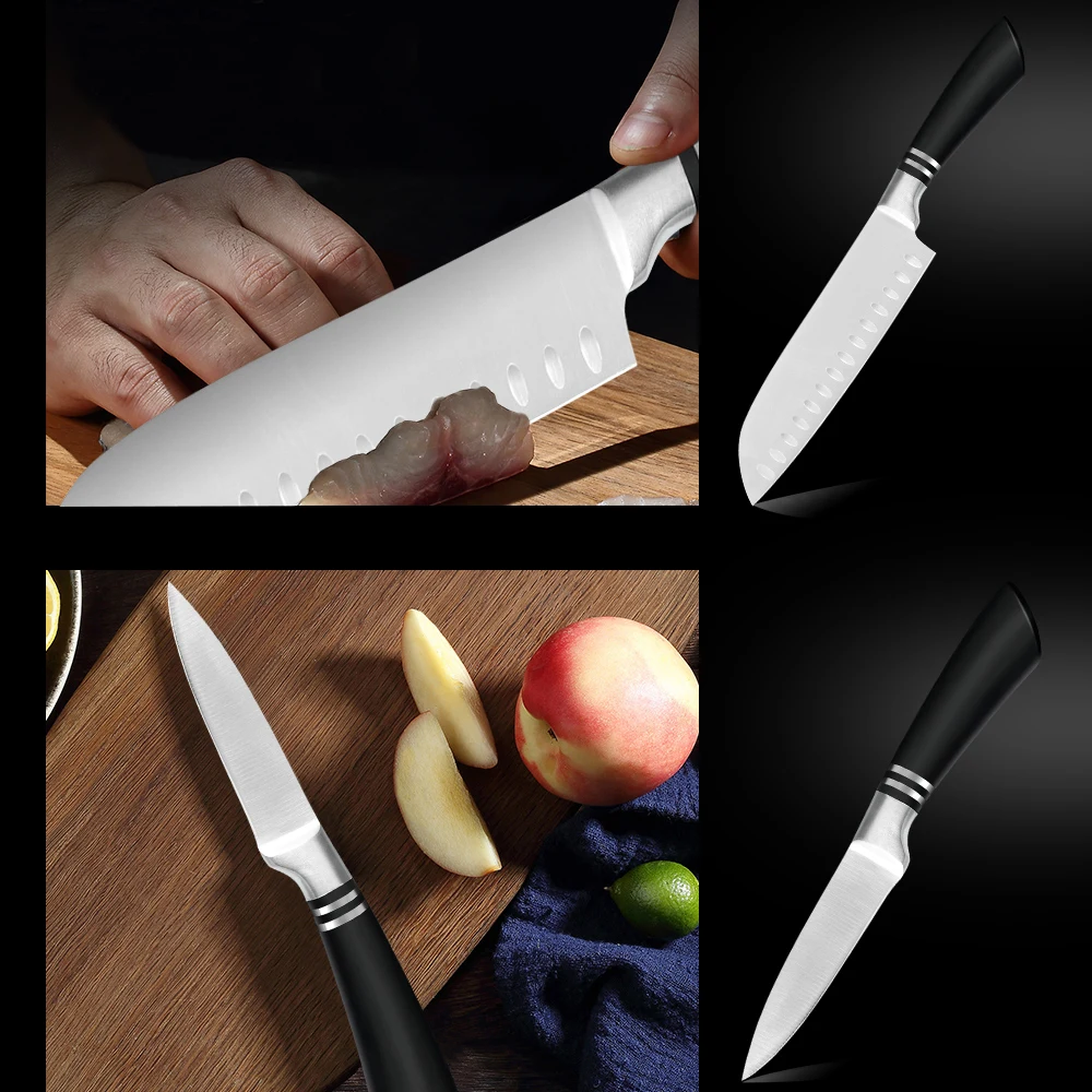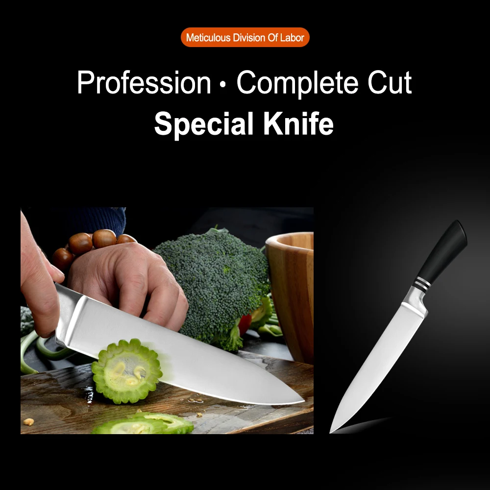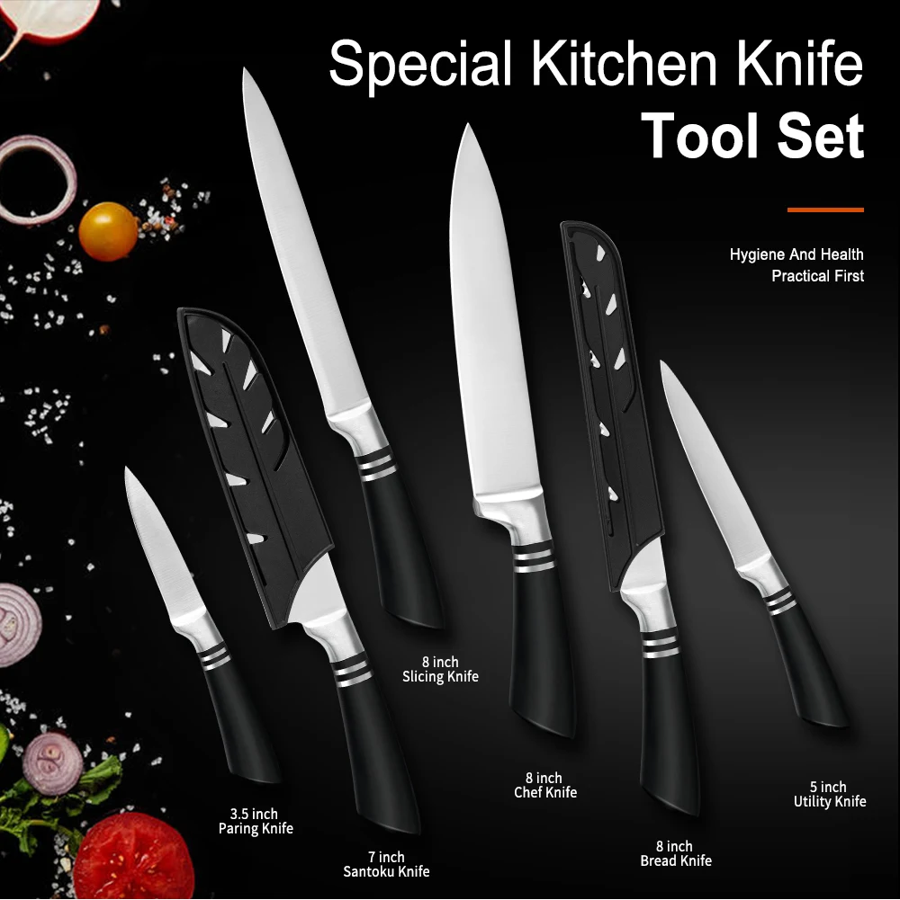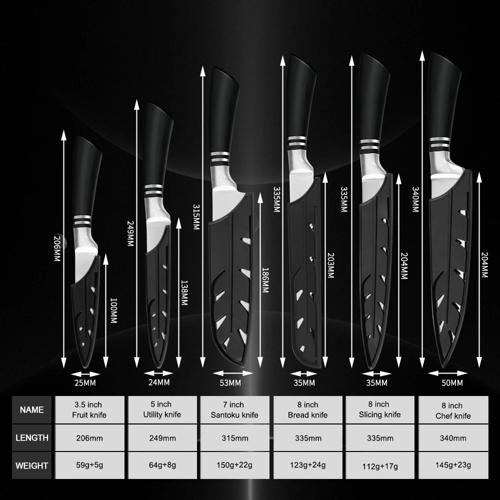 1 * 8 inch Chef Knife 1 * 8 inch Slicing Knife 1 * 8 inch Bread Knife 1 * 7 inch Santoku Knife 1 * 5 inch Utility Knife 1 * 3.5 inch Paring Knife 6 * Knife Cover