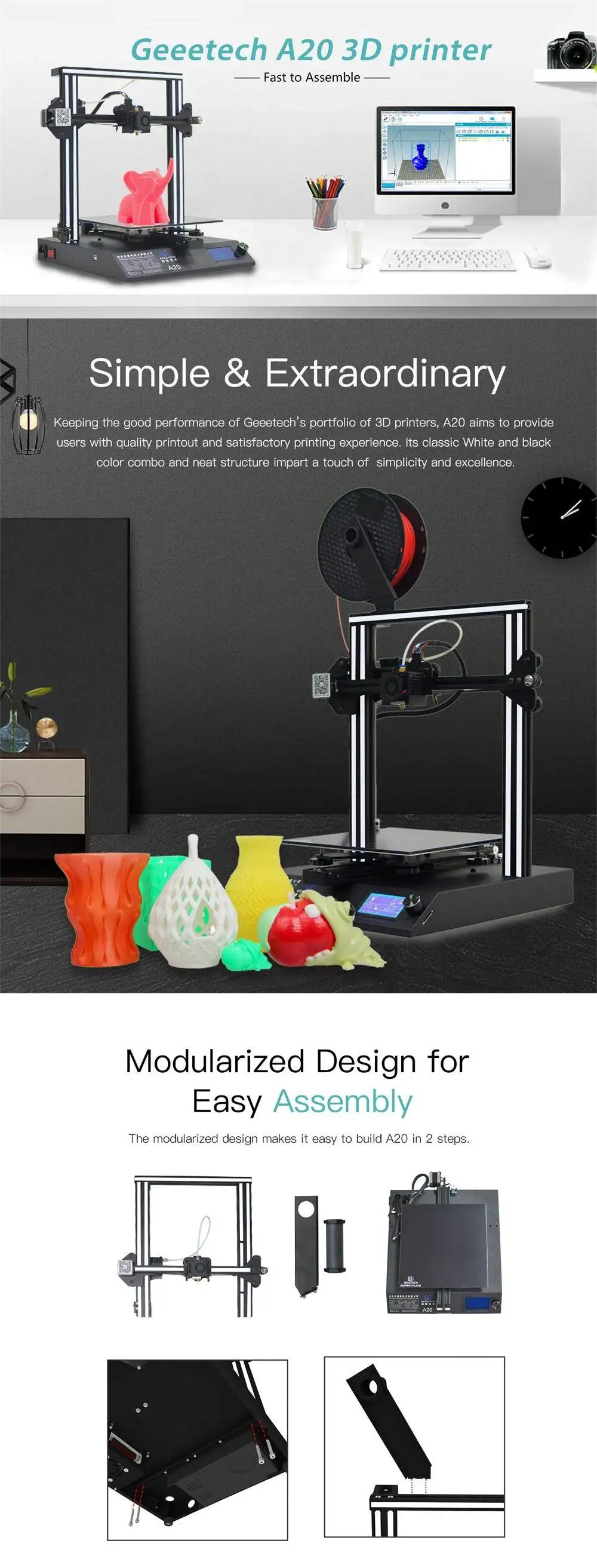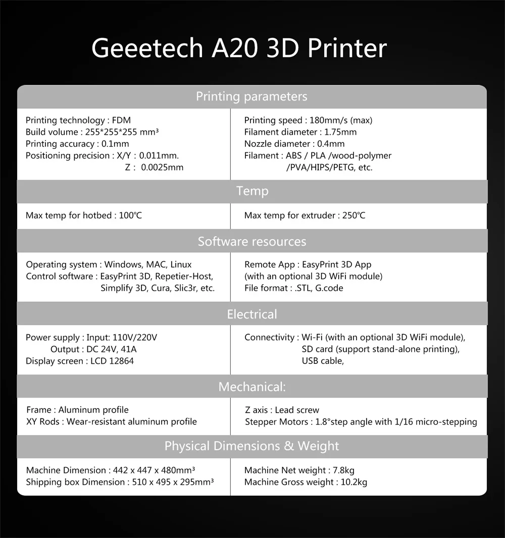 1. С его объемом сборки 250*250*250 мм, A20 делает лучшее из строительной платформы и дает вам полный обзор деталей печати.
