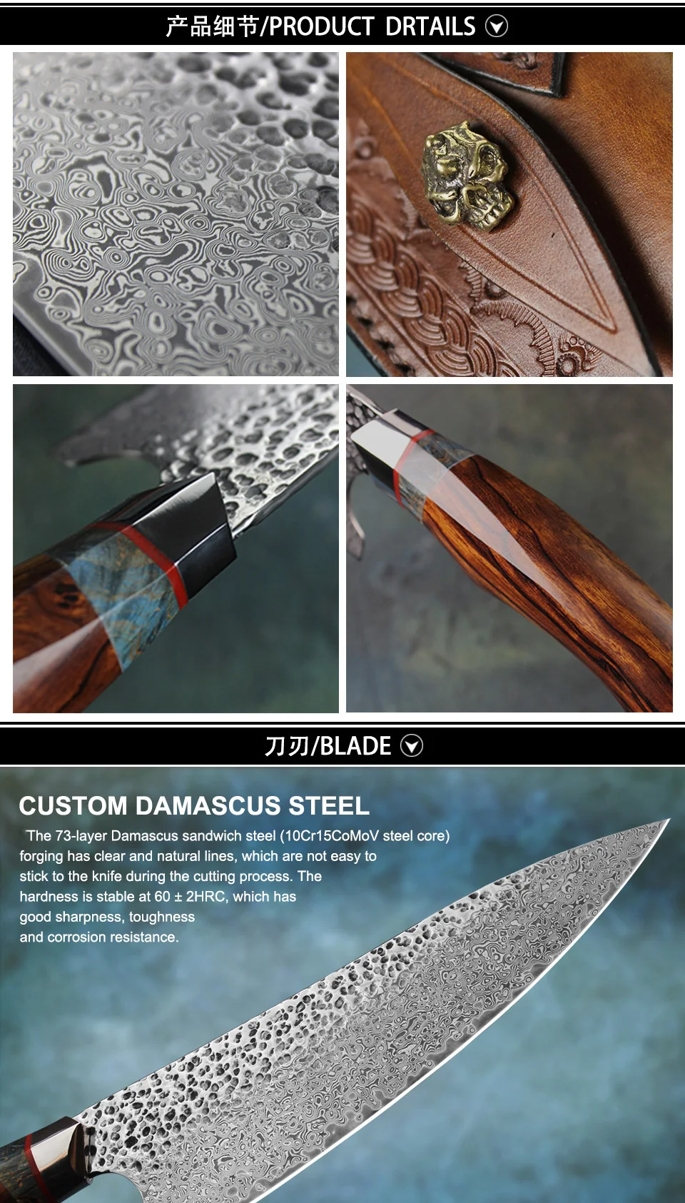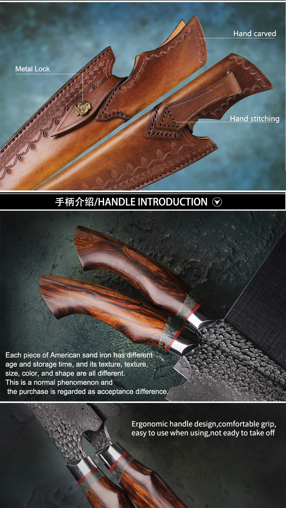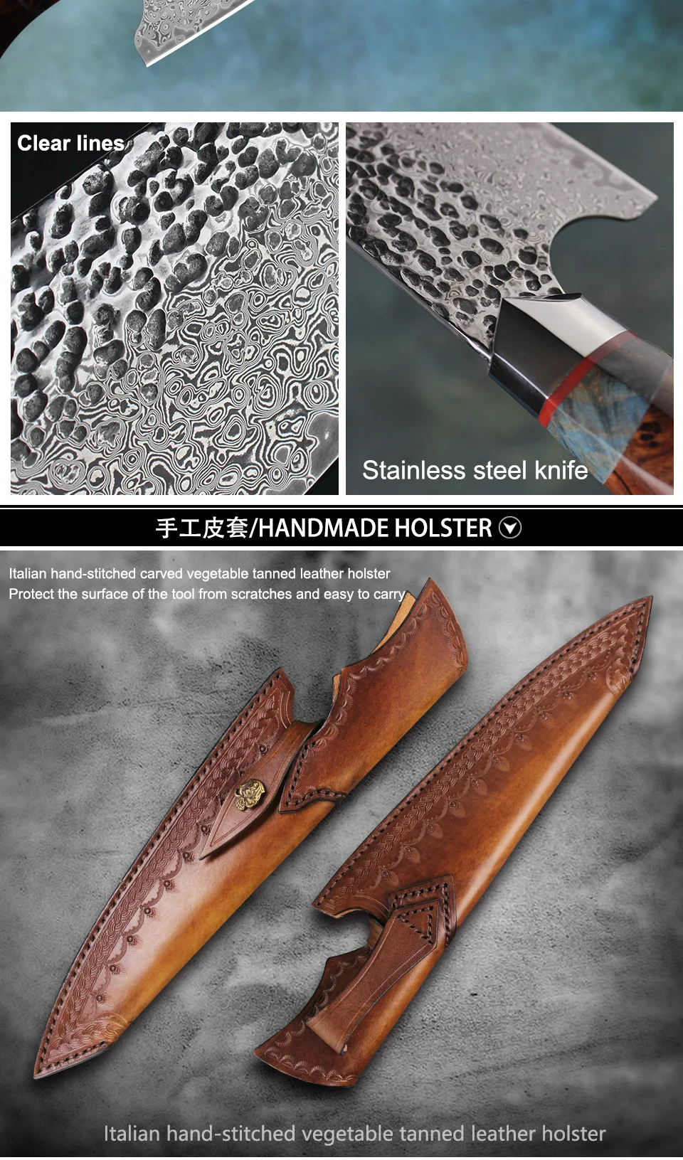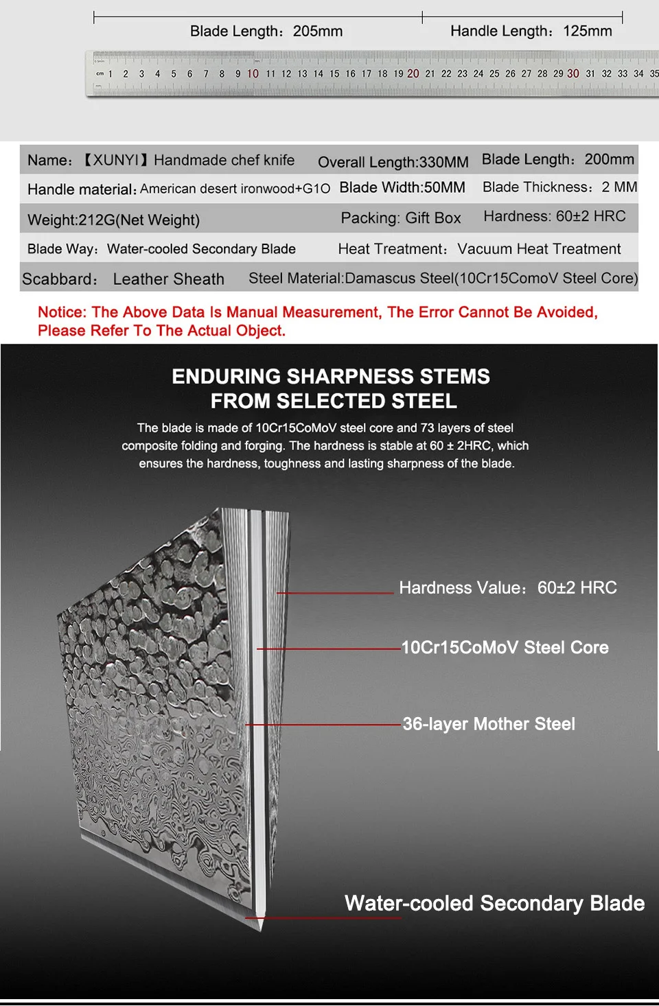 {Размер и материал} 1. [название]: 8-дюймовый поварской нож XUNYI ручной работы с ножнами 2. [общая длина]: 33 см (13 дюймов) 3. [длина лезвия】: 20,5 см (8 дюймов) 4. [ширина лезвия】: 5,3 см (2 дюйма) 5. [Толщина лезвия】: 2 мм (0,08 дюйма) 6. [Вес]: 212 г 7. [Термическая обработка]: вакуумная криогенная Термическая обработка 8. [твердость]: 60 ± 1HRC 9. [материал лезвия】: 73 слоя дамасской стали (стальной сердечник 10Cr15CoMoV) 10. [материал ручки]: Американская пустынная железная древесина + стабилизированная древесина + G10 + валик из нержавеющей стали 11. [материал оболочки]: сшитая вручную итальянская кожа растительного дубления 12. [Упаковка]: подарочная коробка {Введение}: Ручка ножа, отполированная вручную, с круглым радианом, чувствует себя комфортно. Ламинированная сталь ручной работы из дамасской стали с сердечником из стали 10Cr15CoMoV, красивые и изменяемые узоры, практичные и декоративные, добавляют удовольствия вашему времени приготовления пищи.